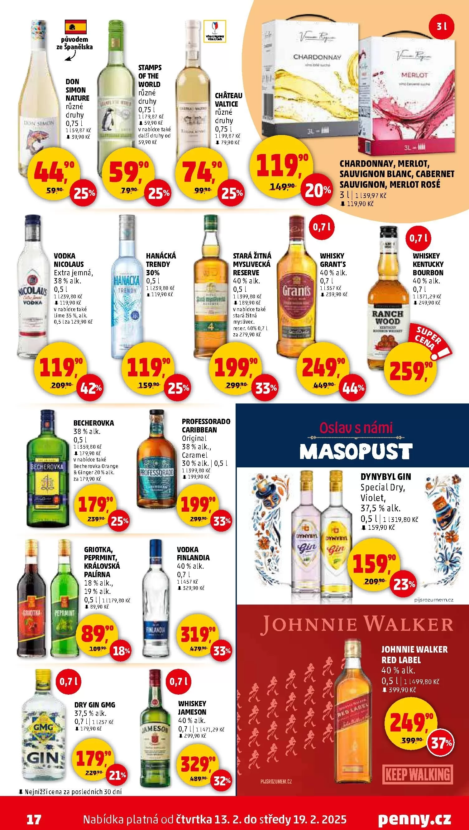 Pokud preferujete lihoviny, můžete si pořídit whisky Grant's za 259,90 Kč nebo Becherovku za 179,90 Kč. V nabídce je také gin Dynybyl special dry za 159,90 Kč a Johnnie Walker Red Label za 399,90 Kč.
