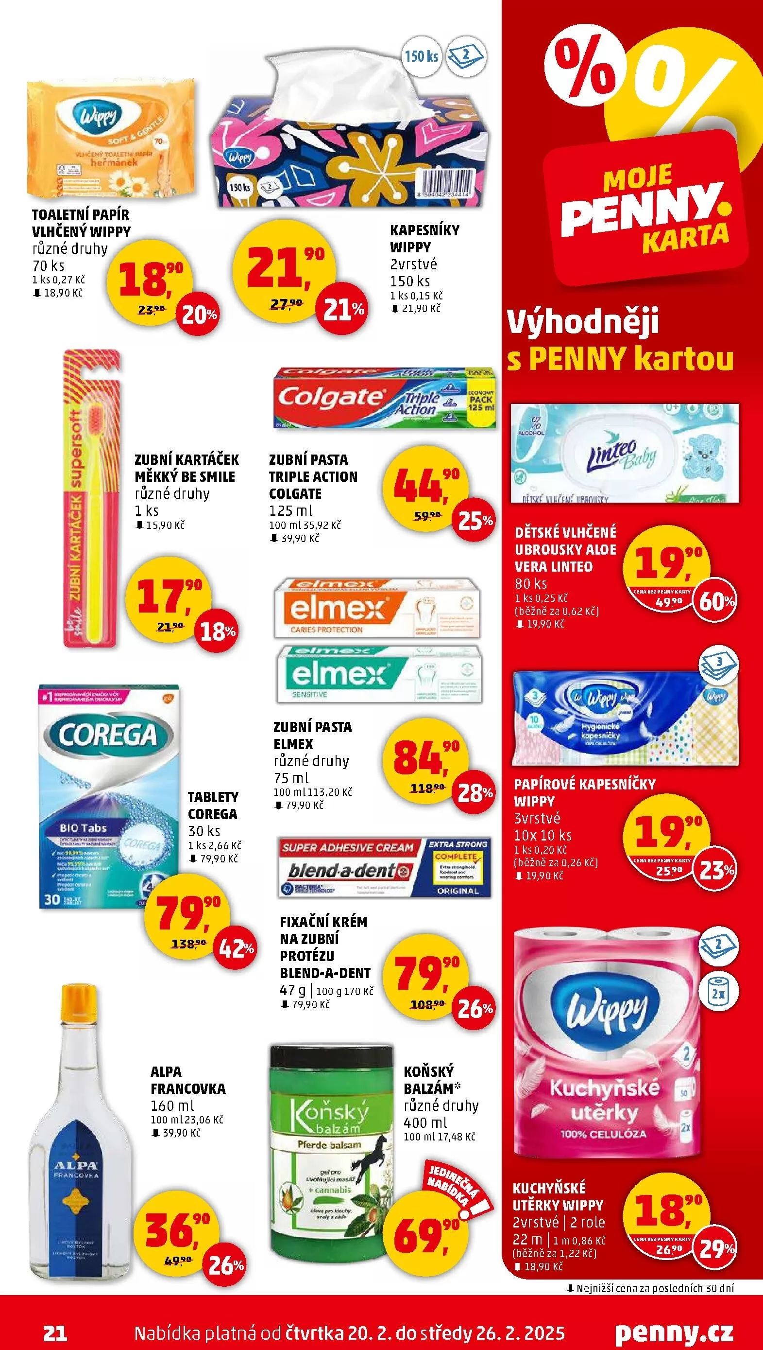 V nabídce jsou také balzámy a francovka Alpa, kuchyňské utěrky Wippy a další produkty, které vám usnadní každodenní péči. Všechny tyto produkty jsou k dispozici za skvělé ceny, které platí od 20. února do 26. února 2025. Nezapomeňte využít Penny kartu pro ještě výhodnější nákupy!