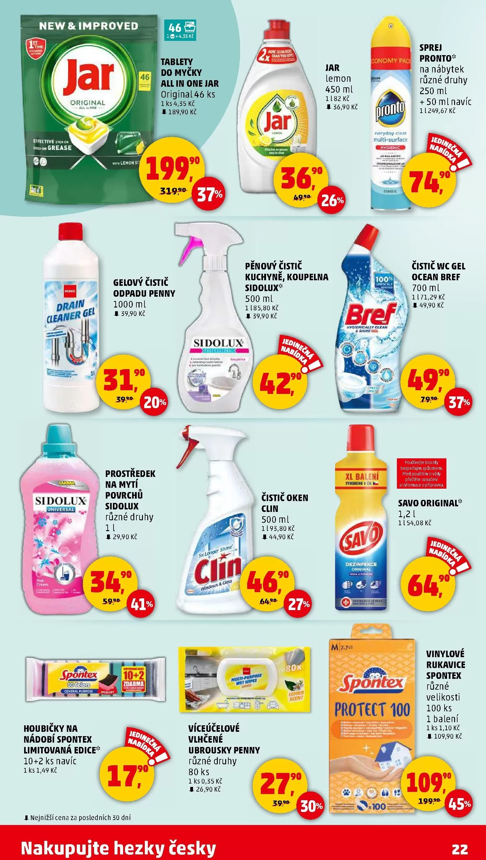 V letáku obchodu Penny Market najdete širokou nabídku produktů pro úklid a domácnost. Mezi nimi se nachází efektivní tablety do myčky Jar All in One, které jsou nyní za skvělou cenu 189,90 Kč za 46 ks. Dále si můžete pořídit čistič gel Ocean Bref o objemu 700 ml za 49,90 Kč nebo multi-surfactant sprej Pronto na nábytek, který je k dispozici v různých druzích za 90 Kč.