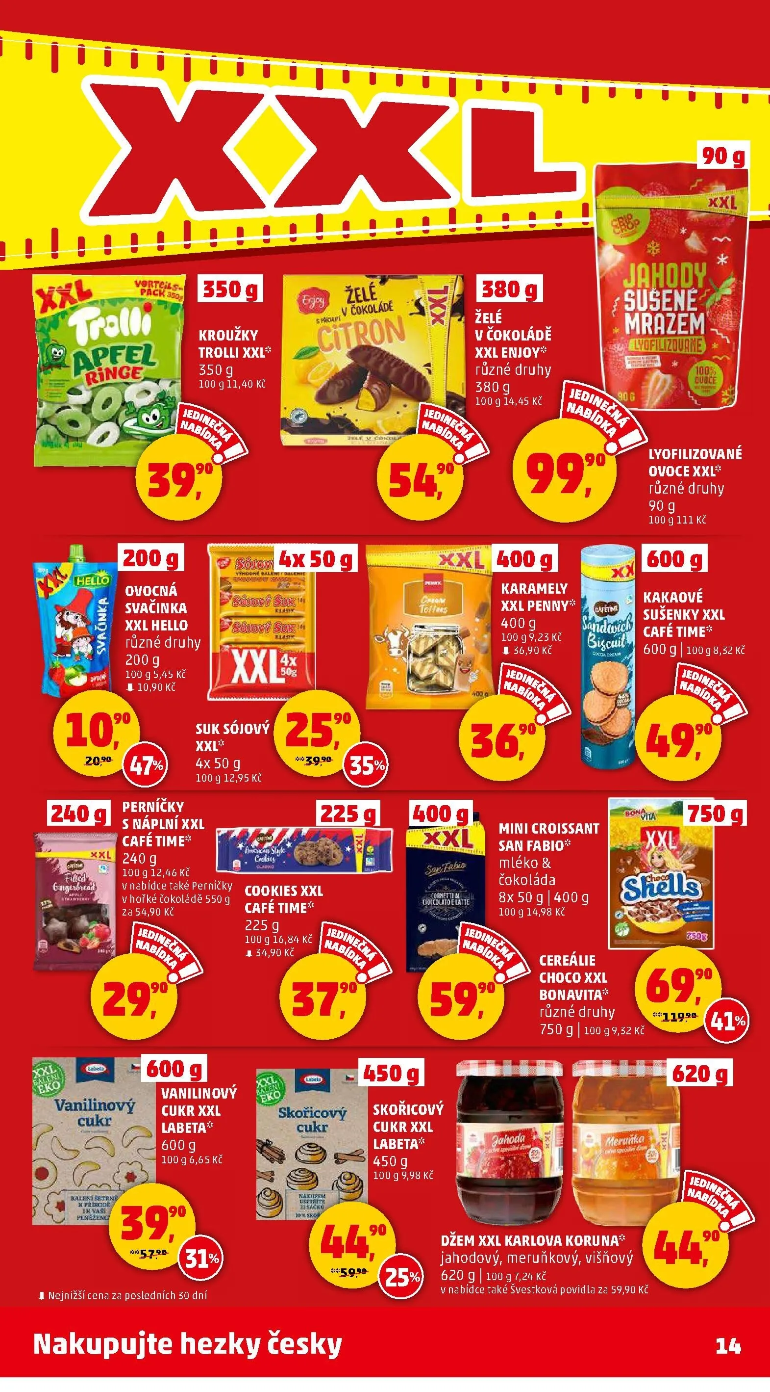 V letáku obchodu Penny Market najdete širokou nabídku produktů, které potěší každého. Mezi oblíbené položky patří kroužky Trolli (350 g) za 11,40 Kč/100 g a želé v čokoládě (380 g) za 14,45 Kč/100 g. Pro milovníky svačinek je tu ovocná svačinka XXL Hello (200 g) za 5,45 Kč/100 g.