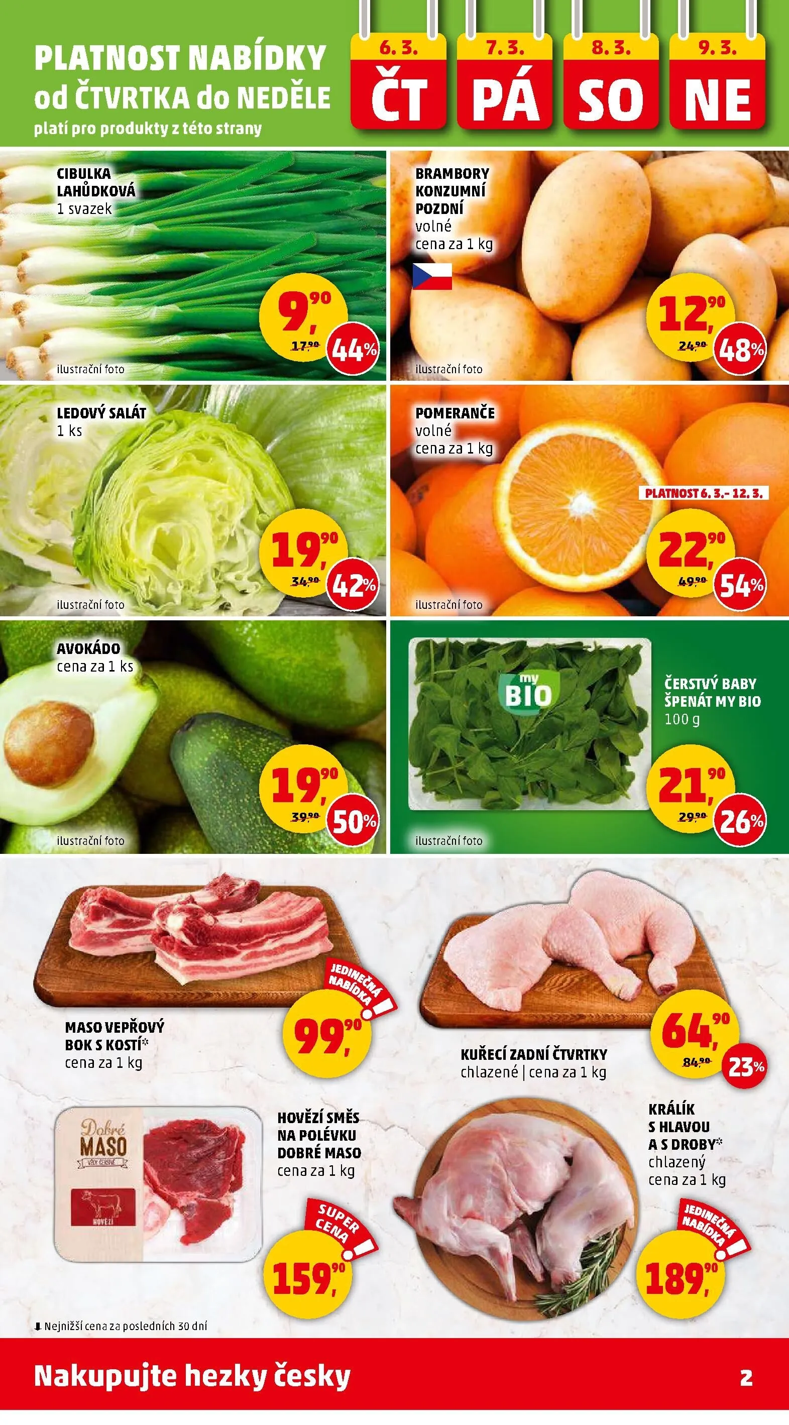 V letáku obchodu Penny Market najdete širokou nabídku čerstvých produktů, které platí od čtvrtka do neděle. Mezi nimi je lahůdková cibulka, ledový salát a avokádo, které jsou k dispozici za výhodné ceny. Dále nabízíme vepřový bok s kostí a hovězí maso na polévku, obojí za cenu za 1 kg. Nezapomeňte také na konzumní brambory a šťavnaté pomeranče, které jsou volně k dostání. Pro milovníky zdravé výživy máme čerstvý baby špenát v bio kvalitě. A nezapomeňte na chlazené kuřecí zadní čtvrtky a králíka s hlavou a droby. Nakupujte hezky česky!