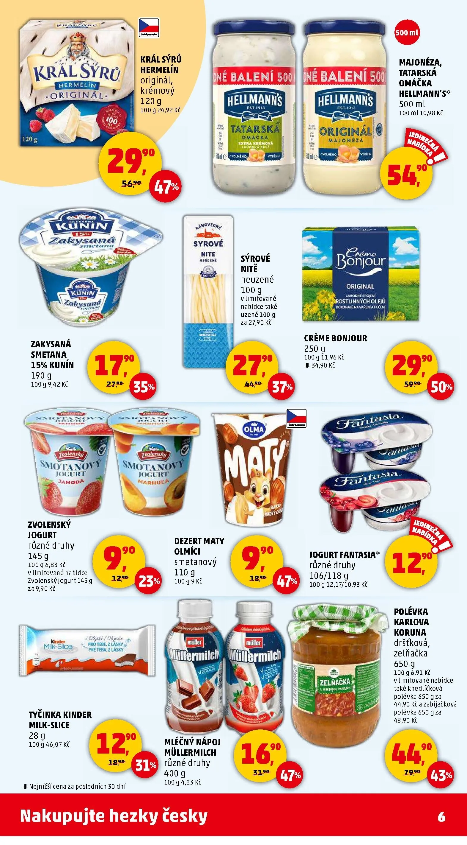 V letáku obchodu Penny Market najdete širokou nabídku kvalitních produktů. Mezi nimi se vyjímají Král sýrů hermelín, který je krémový a balení 100 g stojí 24,92 Kč. Dále je zde zakysaná smetana Kunín 190 g za 9,42 Kč a Zvolenský jogurt v různých druzích 145 g za 9,90 Kč.