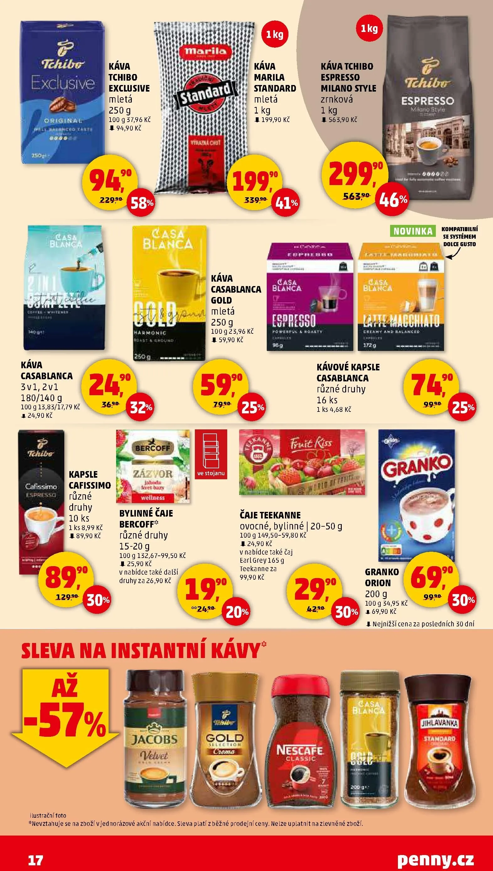 V letáku obchodu Penny Market najdete širokou nabídku káv a čajů za skvělé ceny. Mezi exkluzivními produkty se objevuje mletá káva Tchibo za 94,90 Kč za 250 g, která je nyní v akci se slevou 58%. Dále si můžete vybrat z kávy Casablanca 3v1 a 2v1, která je k dostání za 24,90 Kč za 180 g. Pro milovníky zrnkové kávy je tu Tchibo Espresso Milano Style za 565,90 Kč.