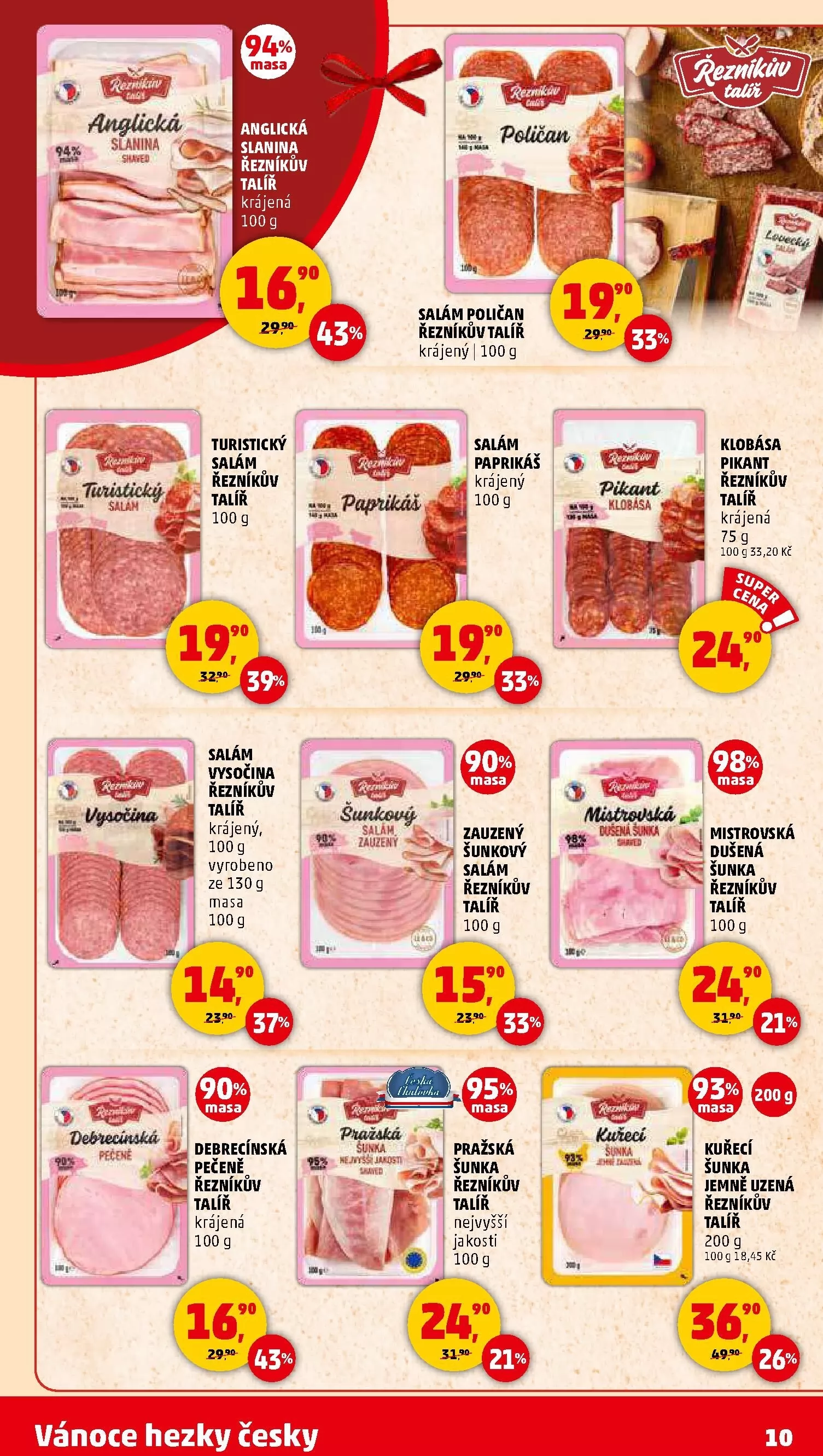 V letáku obchodu Penny Market najdete širokou nabídku kvalitních masných výrobků z řezníkových talířů. Mezi nimi se objevují lahodné anglické slaniny, turistické salámy a vysočinské salámy, všechny s vysokým podílem masa. Dále si můžete vychutnat debrecínskou pečeni, salám poličan a pikantní klobásu. Nechybí ani pražská šunka a jemná kuřecí šunka, které jsou ideální pro vánoční stůl. Všechny produkty jsou pečlivě vyrobeny z kvalitních surovin a nabízejí skvělou chuť za výhodné ceny.