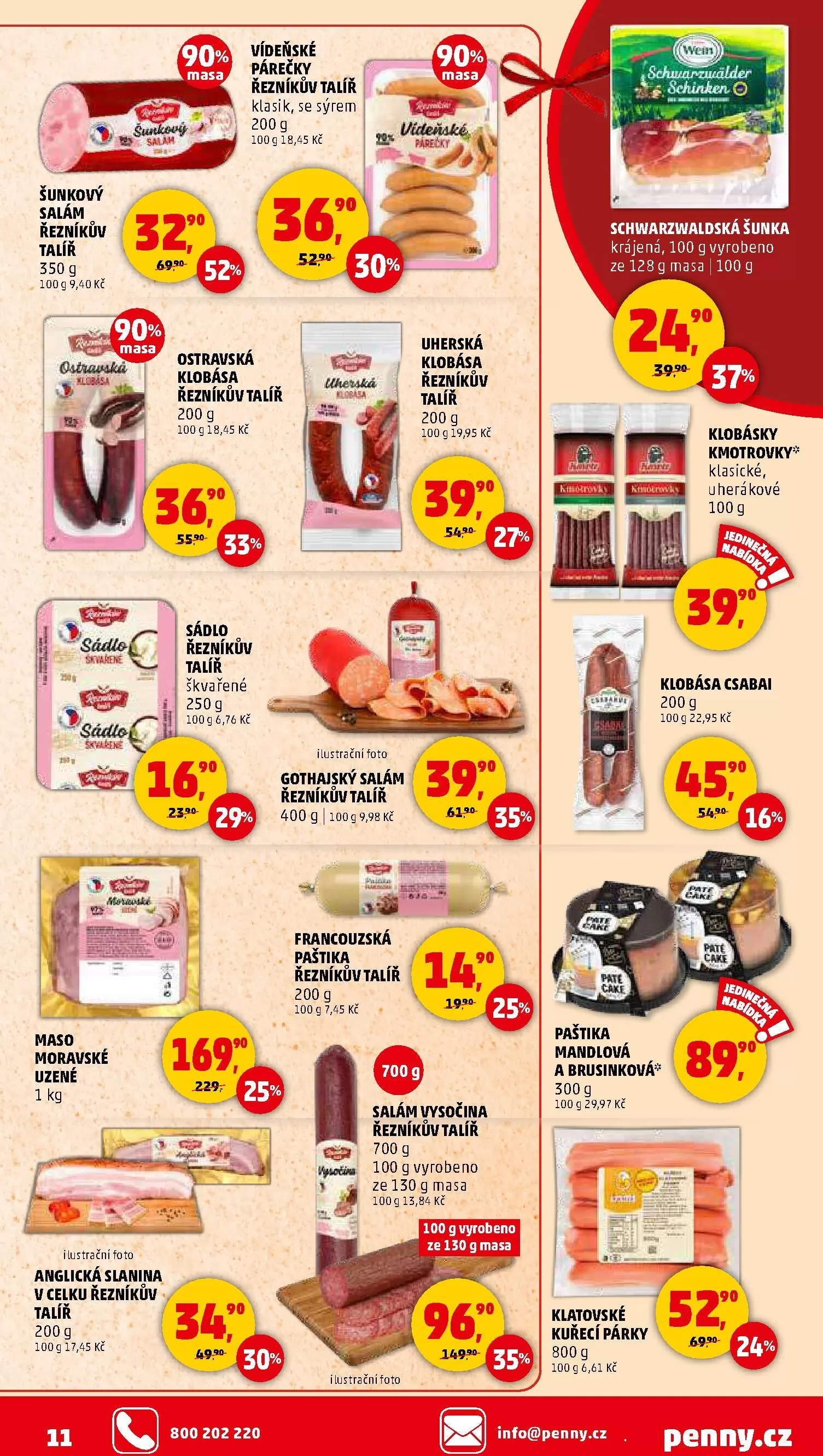 V letáku obchodu Penny Market najdete širokou nabídku masných výrobků, které potěší každého milovníka kvalitního masa. Mezi nabízenými produkty se nachází šunkový salám "řezníkův talíř" o hmotnosti 350 g za 9,40 Kč, nebo párečky "řezníkův talíř" klasické se sýrem, které váží 200 g a stojí 18,45 Kč.