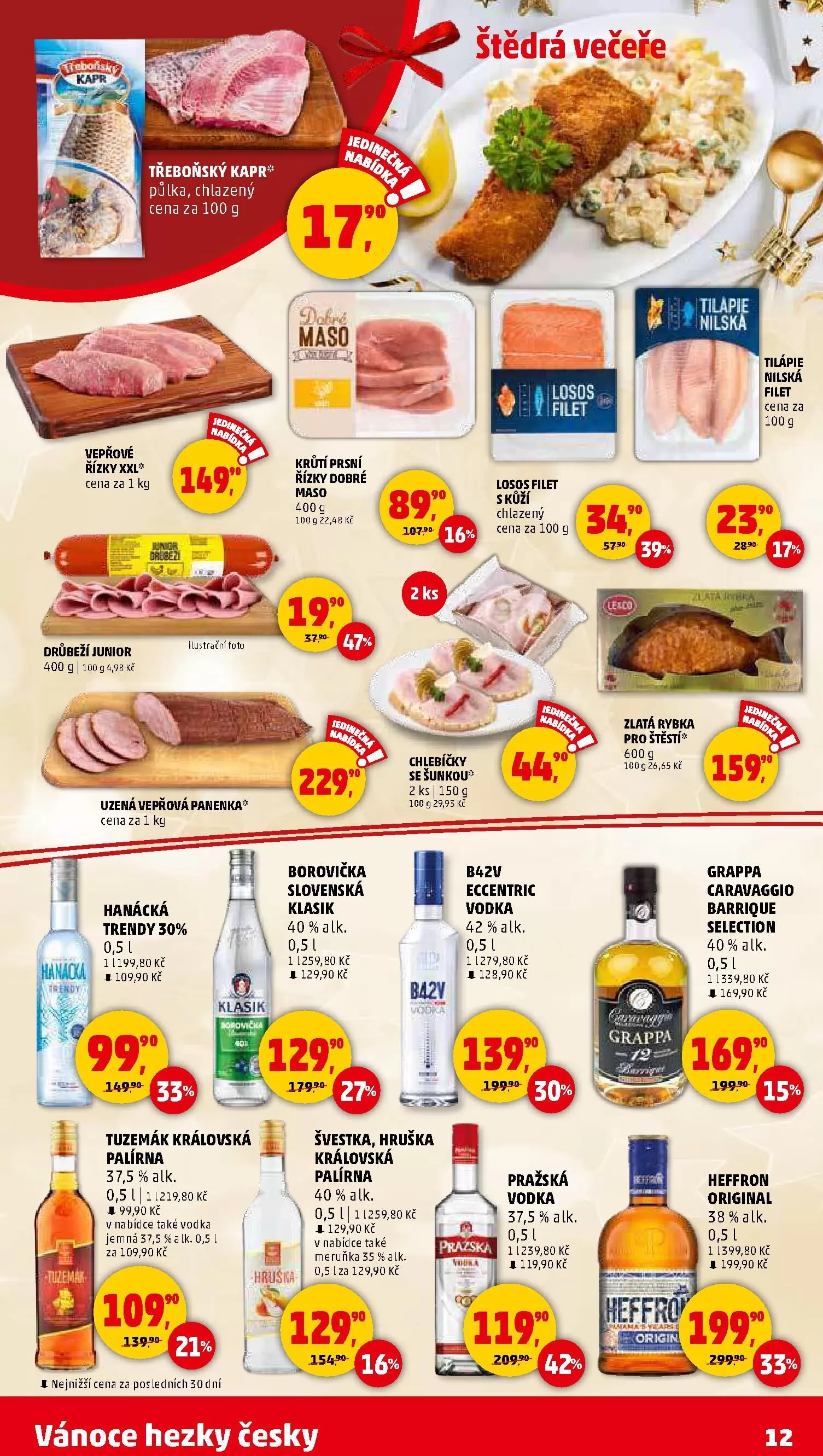 Nezapomeňte na uzenou vepřovou panenku a klasický tuzemák z královské palírny za 99,90 Kč. Vodka jemná 37,5 % je také v nabídce za 109,90 Kč.