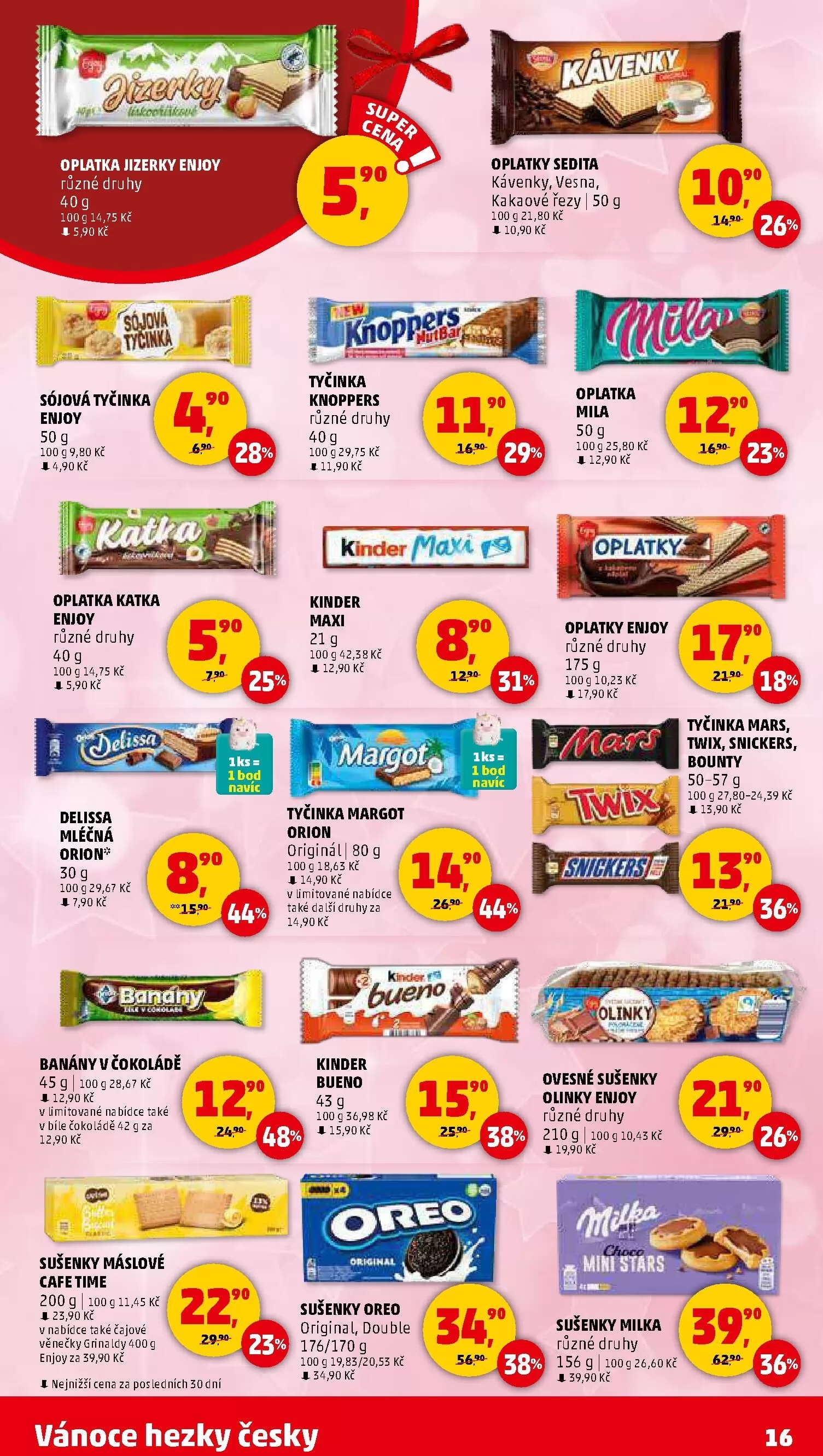 V limitované nabídce najdete tyčinku Margot za 18,63 Kč za 100 g a Kinder Bueno za 36,98 Kč za 100 g. Sušenky Oreo jsou k dispozici za 34,90 Kč za 100 g. Oplatka Mila stojí 25,80 Kč za 50 g a ovesné sušenky Olinky Enjoy za 19,90 Kč za 210 g.