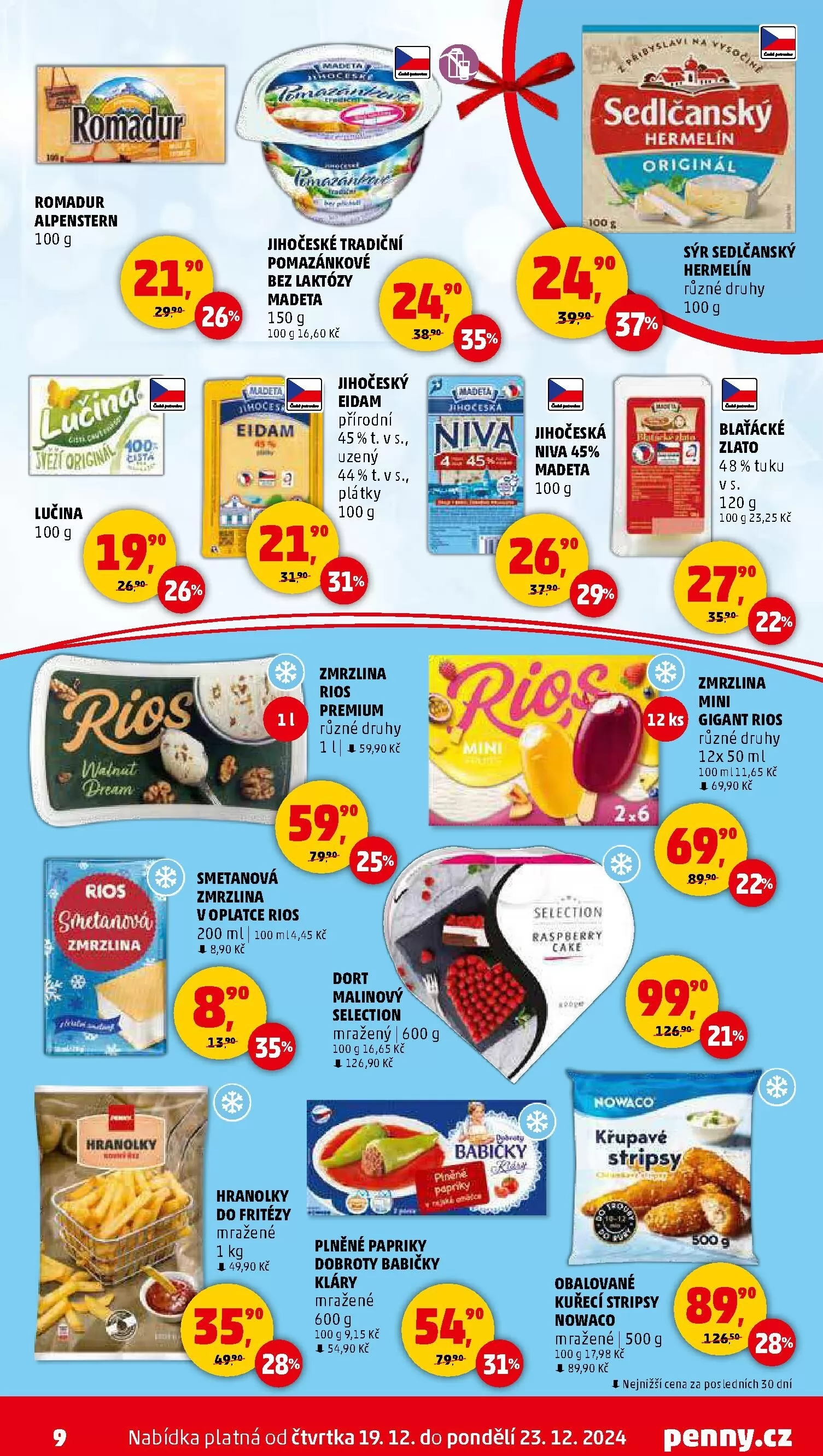 V letáku obchodu Penny Market najdete širokou nabídku kvalitních potravin. Mezi produkty patří například madur a romadur sýry, alpenstern, lučina a jihočeské tradiční pomazánkové bez laktózy od Madety. Dále si můžete vybrat z různých druhů hermelínu, eidamu a smetanové zmrzliny v oplatce Rios.