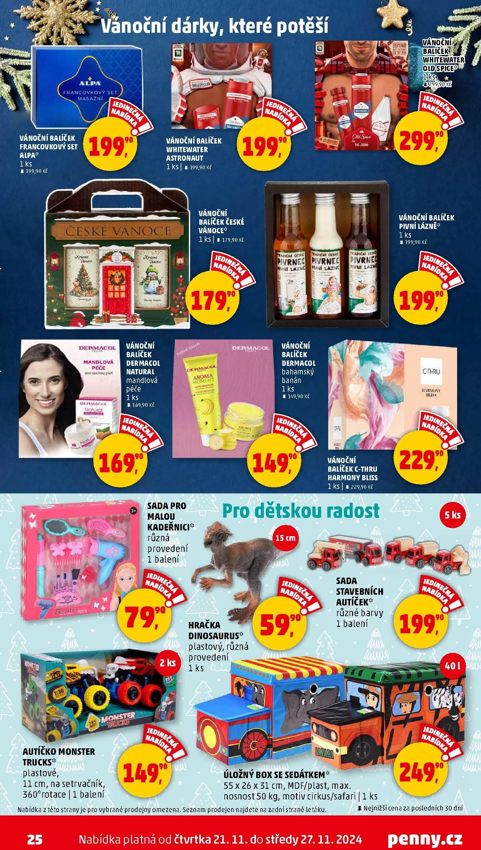Nezapomeňte také na vánoční balíček s pivními lázněmi za 199,90 Kč a plastového dinosaura. Všechny tyto produkty jsou k dostání v omezeném množství, proto neváhejte a navštivte vybranou prodejnu od 21. do 27. listopadu 2024.