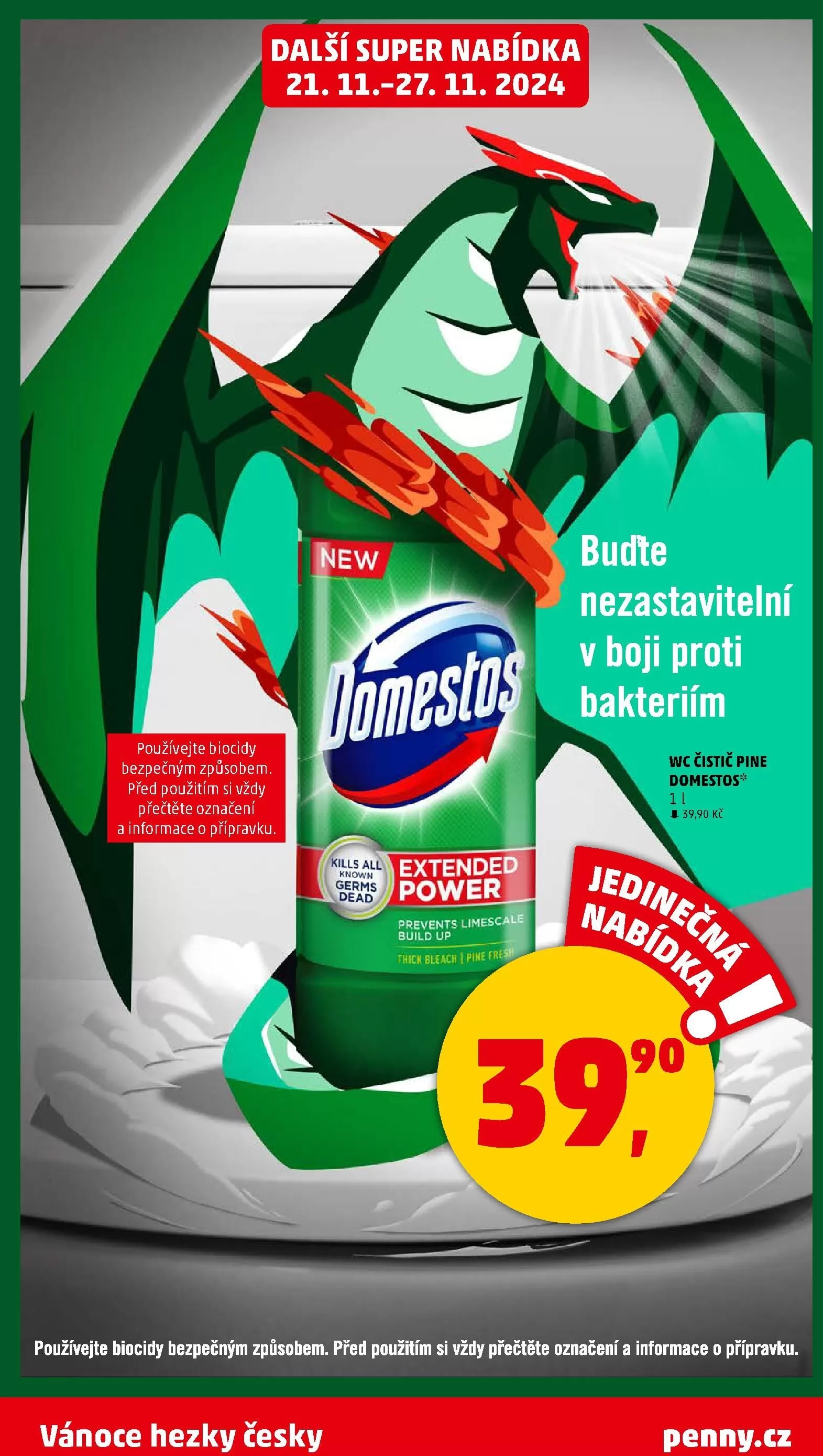 V letáku obchodu Penny Market na období od 21. 11. do 27. 11. 2024 najdete skvělé nabídky! Mezi nimi se objevuje WC čistič Pine Domestos za cenu 39,90 Kč. Tento produkt je účinný v boji proti bakteriím a pomáhá předcházet usazování vodního kamene. Nezapomeňte používat biocidy bezpečným způsobem a vždy si přečíst označení a informace o přípravku. Připravte se na Vánoce hezky česky s Penny!
