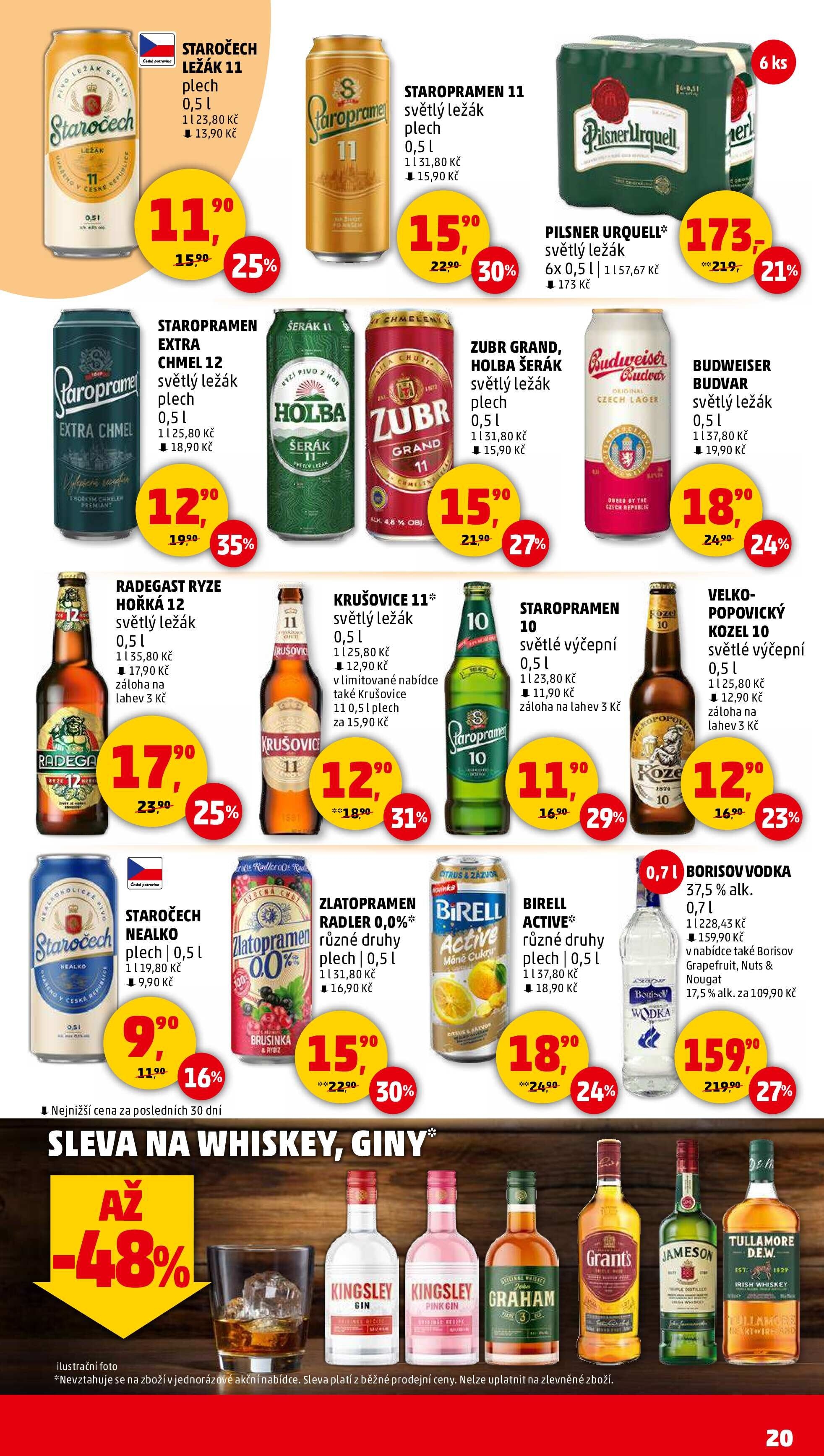 Mezi oblíbené produkty patří ležáky jako Staropramen, Pilsner Urquell a Krušovice, které jsou k dispozici v plechovkách za ceny od 11,90 Kč.