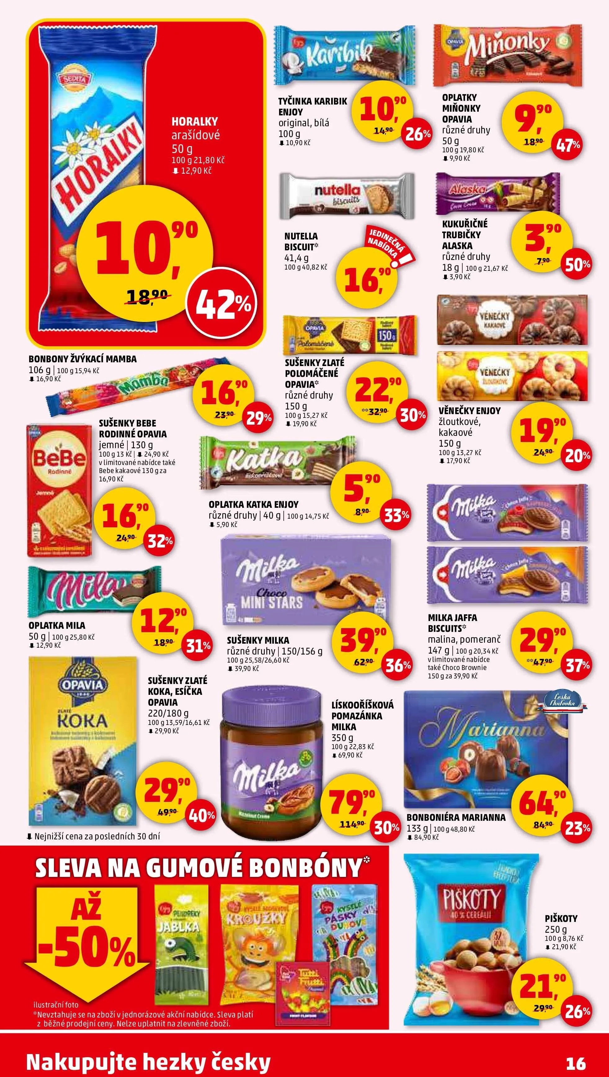 Pro milovníky sušenek jsou k dispozici Zlaté polomáčené sušenky Opavia za 19,90 Kč za 150 g a jemné sušenky Bebe za 24,90 Kč za 130 g. Nezapomeňte také na oplatky Miňonky Opavia za 9,90 Kč za 50 g a kukuřičné trubičky Alaska za 3,90 Kč za 18 g.