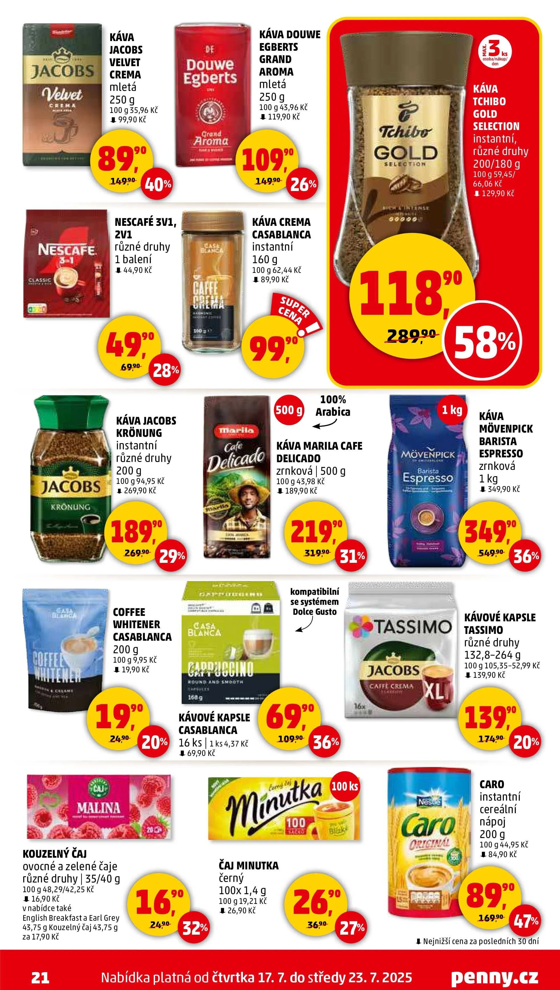 V letáku obchodu Penny Market najdete širokou nabídku káv a čajů za skvělé ceny. Mezi oblíbené produkty patří mletá káva Jacobs Velvet Crema (250 g) za 99,90 Kč a instantní káva Jacobs Krönung (200 g) za 269,90 Kč. Pro milovníky instantní kávy je k dispozici také Nescafé 3v1 za 44,90 Kč.