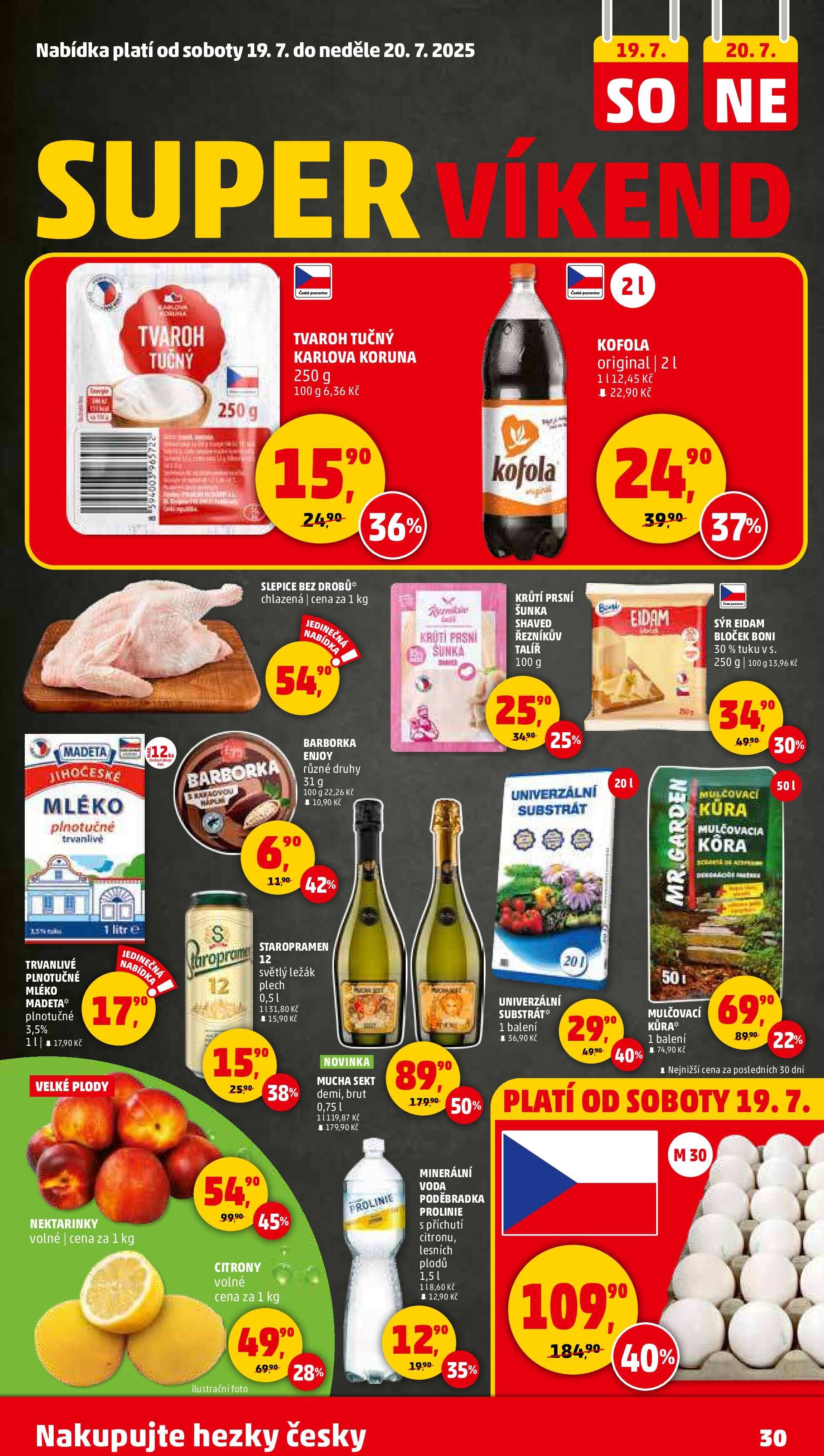 Pro milovníky nápojů je v nabídce Staropramen světlý ležák plech za 31,80 Kč a Kofola originál za 22,90 Kč. Nezapomeňte také na čerstvé nektarinky za cenu 89,90 Kč/kg a minerální vodu Podebradka za 12,90 Kč.