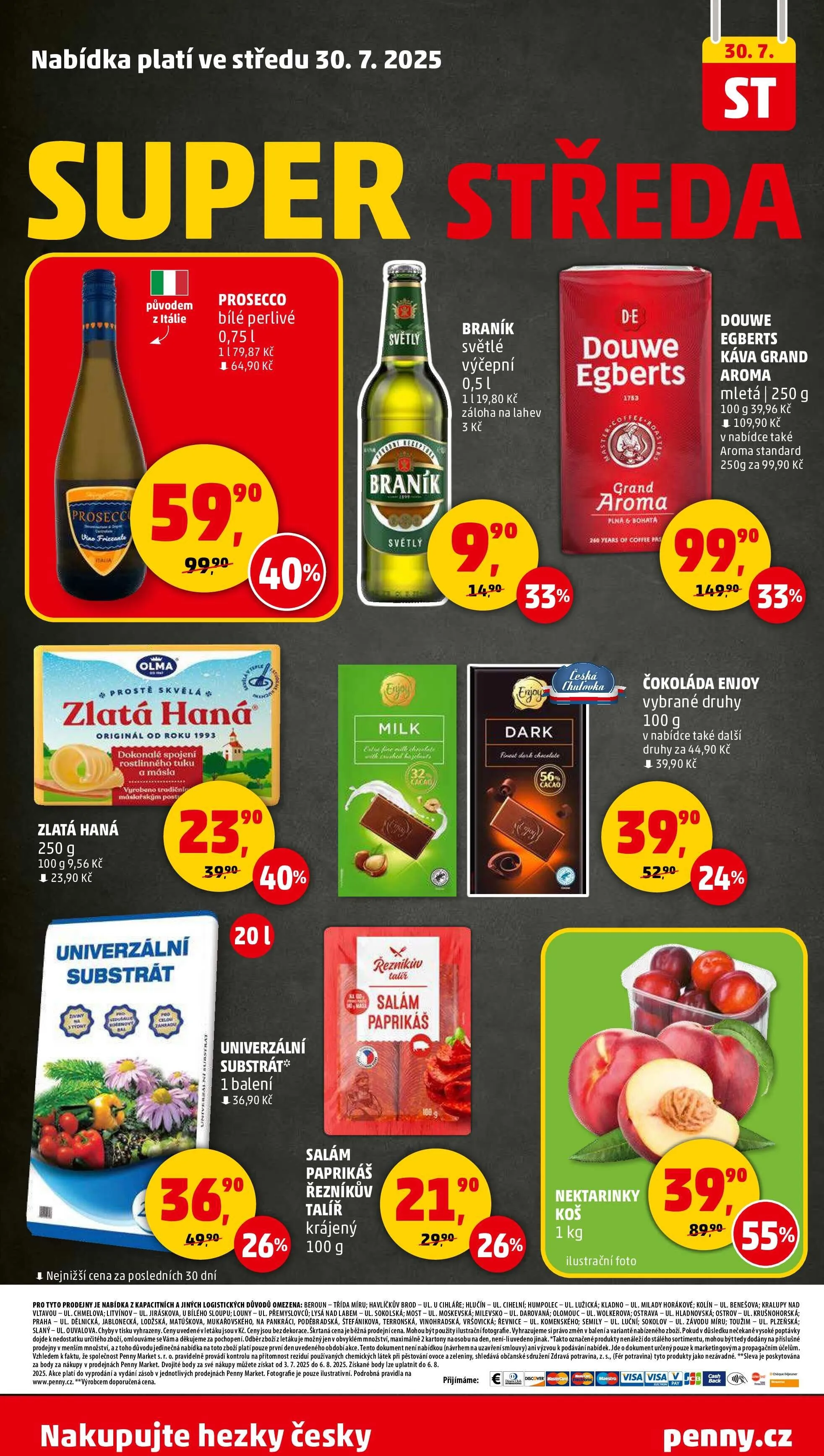 V letáku obchodu Penny Market najdete skvělé nabídky, které platí ve středu 30.7.2025. Mezi produkty se objevuje italské Prosecco za 64,90 Kč, světlý Braník a řezníkův salám Paprikáš. Milovníci kávy ocení Douwe Egberts Grand Aroma mletou kávu za 109,90 Kč. Dále je v nabídce máslo Zlatá Haná a univerzální substrát. Nezapomeňte také na čokoládu Enjoy a čerstvé nektarinky. Ceny jsou bez dekorace a mohou se lišit v závislosti na prodejně. Nakupujte hezky česky!