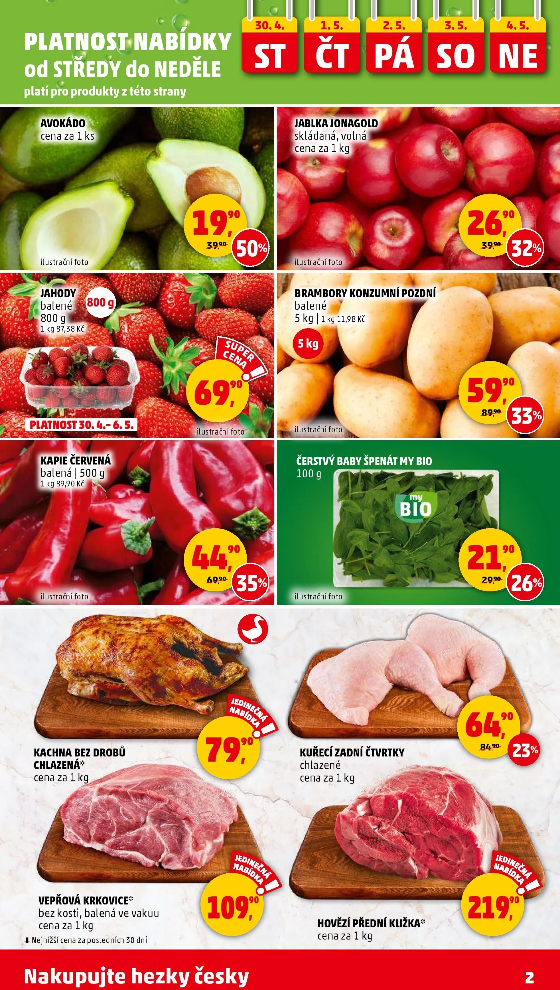 V letáku obchodu Penny Market najdete širokou nabídku čerstvých produktů. Mezi nimi jsou jablka Jonagold, která jsou k dostání volně a za cenu 29,90 Kč za 1 kg. Dále si můžete pořídit avokádo za 29,90 Kč za kus a jahody v balení 800 g za 89,90 Kč.