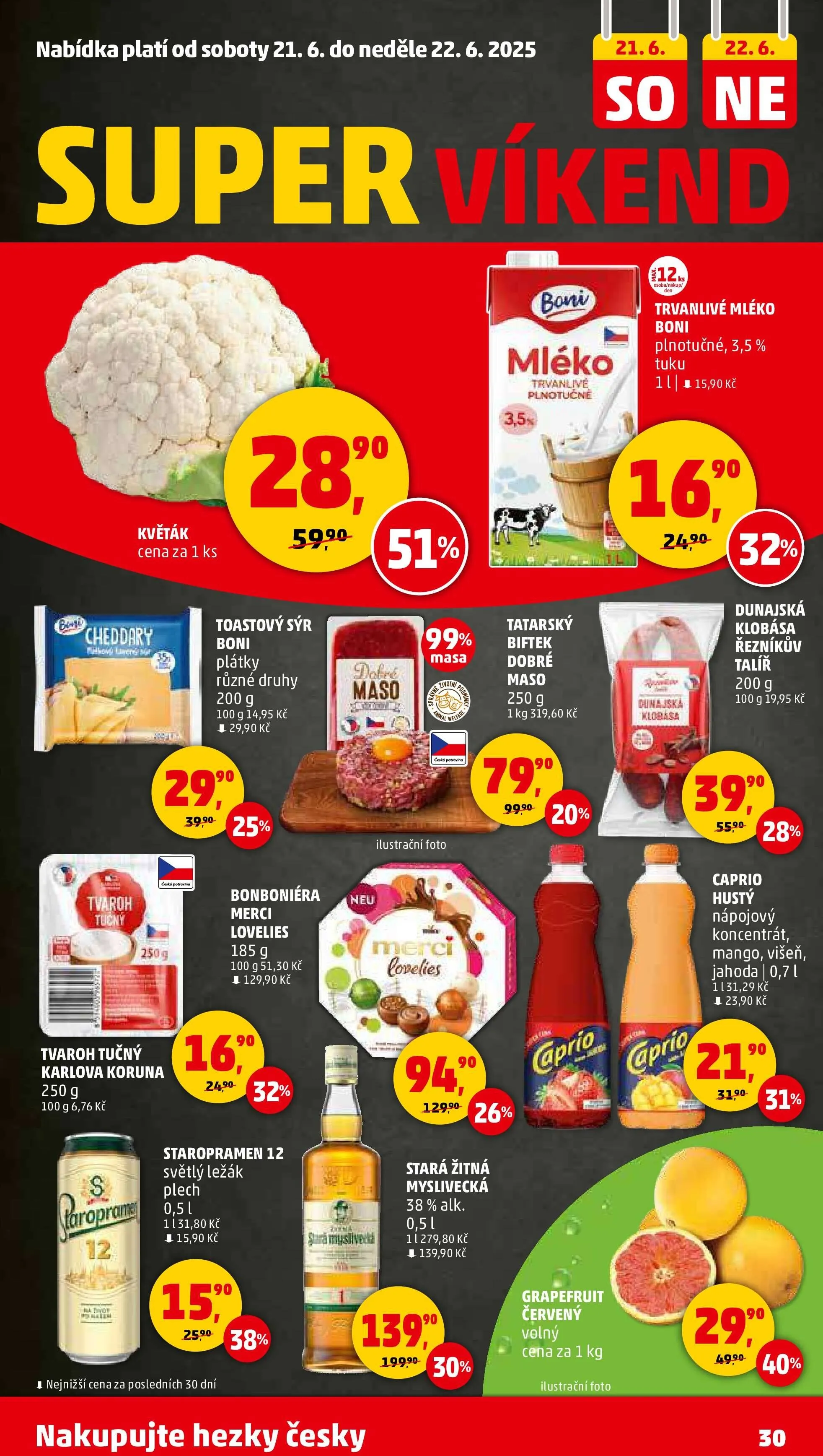 Dále si můžete pořídit červený grapefruit za nejnižší cenu za posledních 30 dní a Dunajskou klobásu za 39,90 Kč.