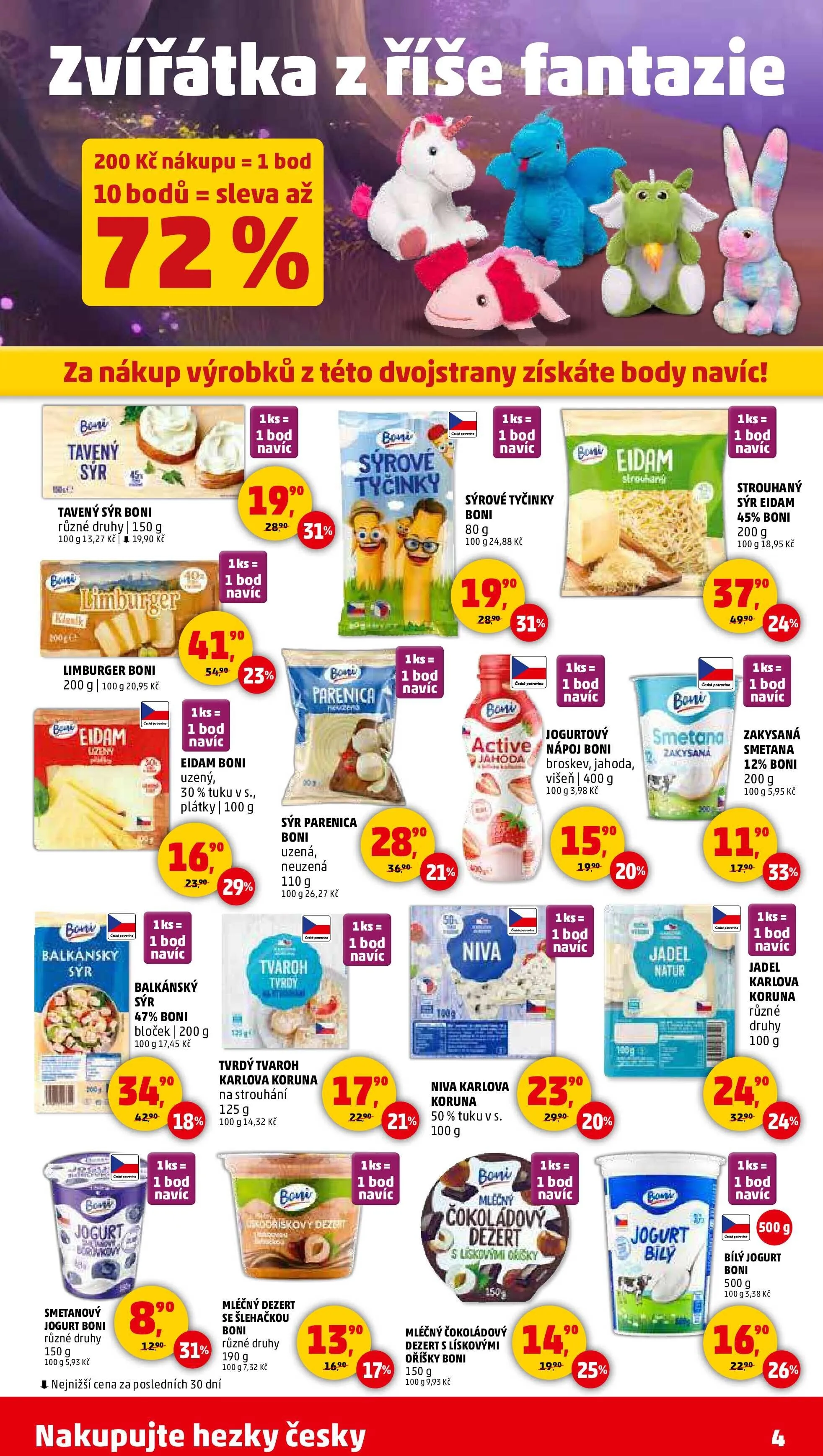 V letáku obchodu Penny Market najdete širokou nabídku produktů z říše fantazie. Při nákupu nad 200 Kč získáte 1 bod, a za 10 bodů můžete uplatnit slevu. Mezi nabízenými produkty se nachází tavený sýr Boni v různých druzích, limburger, sýrové tyčinky a eidam.