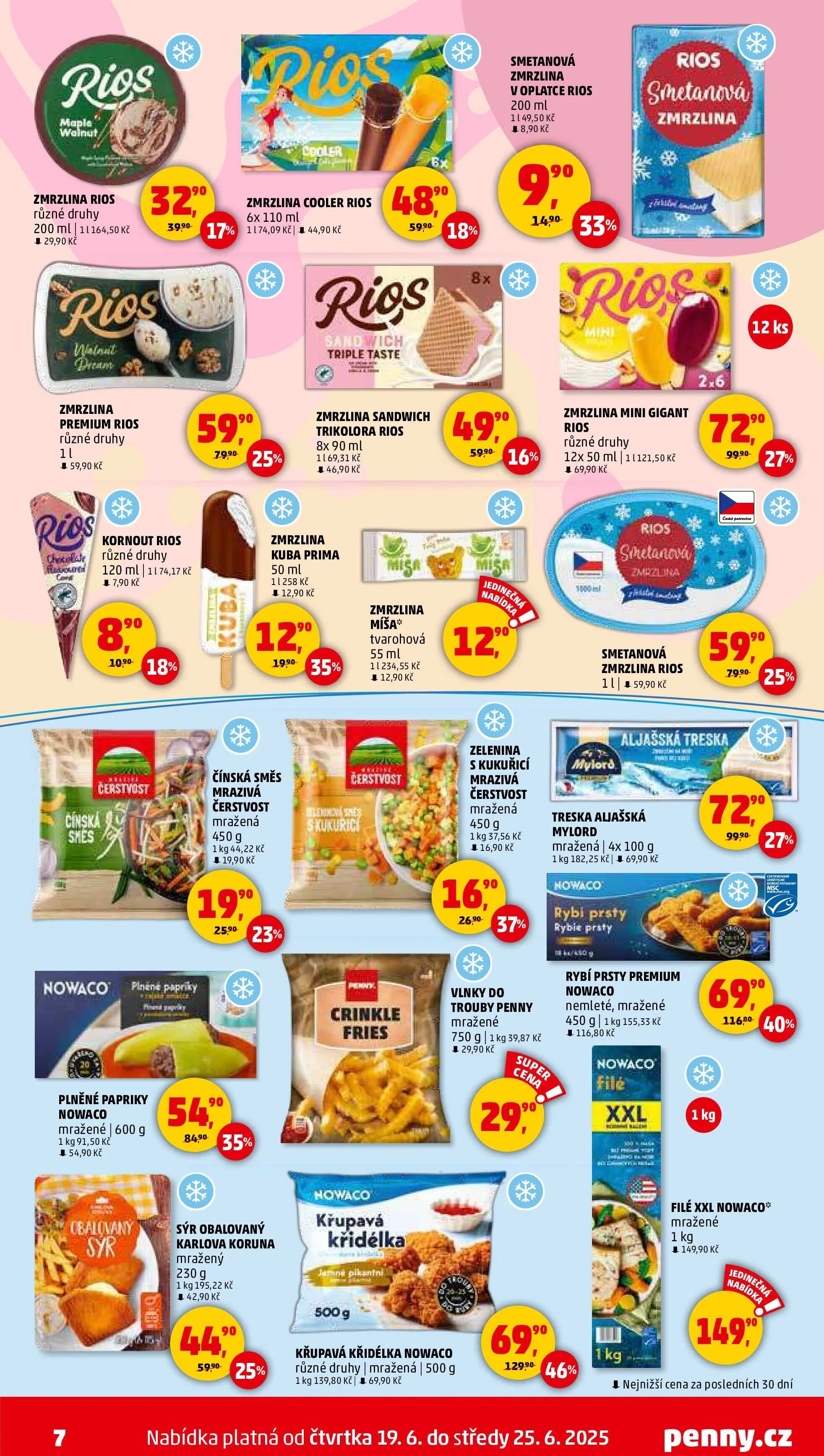 V letáku obchodu Penny Market najdete širokou nabídku mražených produktů a zmrzlin. Mezi oblíbené zmrzliny patří Rios v různých druzích, které jsou k dispozici od 7,90 Kč za kornouty až po 69,90 Kč za mini gigant. Dále si můžete vybrat z mražených plněných paprik Nowaco nebo čínské směsi, které jsou cenově dostupné od 19,90 Kč.
