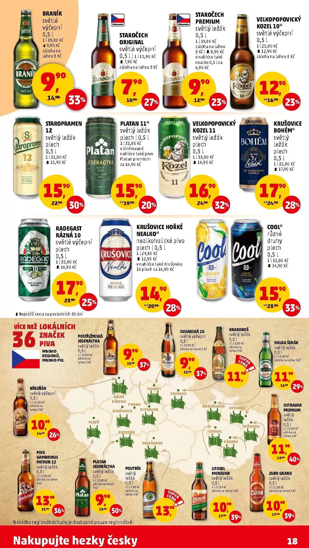Produkt: Velkopopovický Kozel, kategorie: světlý ležák, cena: 16,90 Kč, záloha na lahev: 90 Kč