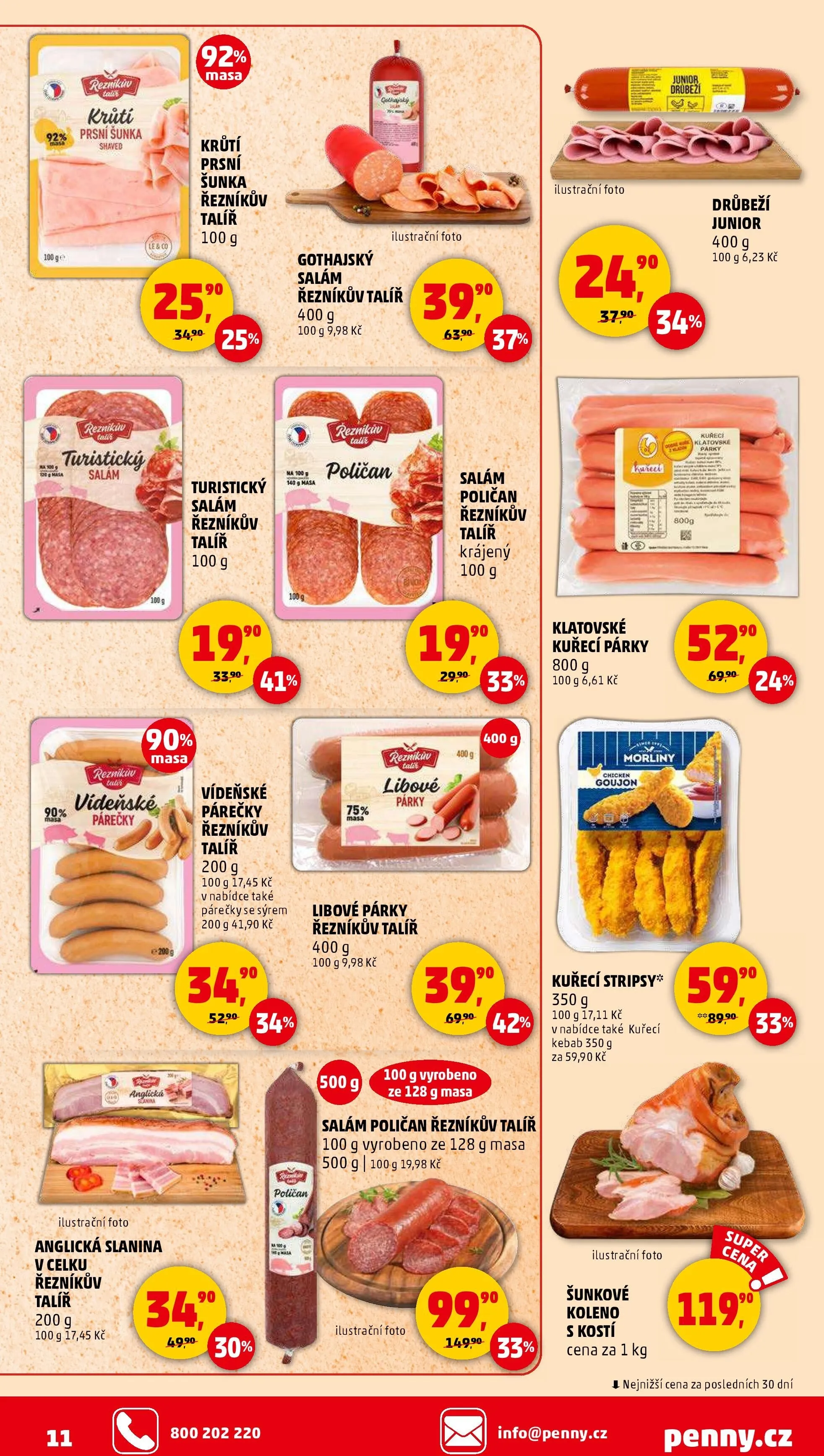 V letáku obchodu Penny Market najdete širokou nabídku masných výrobků. Mezi nimi se objevují prsní šunky, vídeňské párečky a turistický salám, které jsou k dostání v různých gramážích. Například řezníkův talíř o hmotnosti 200 g je nyní za skvělou cenu 17,45 Kč.