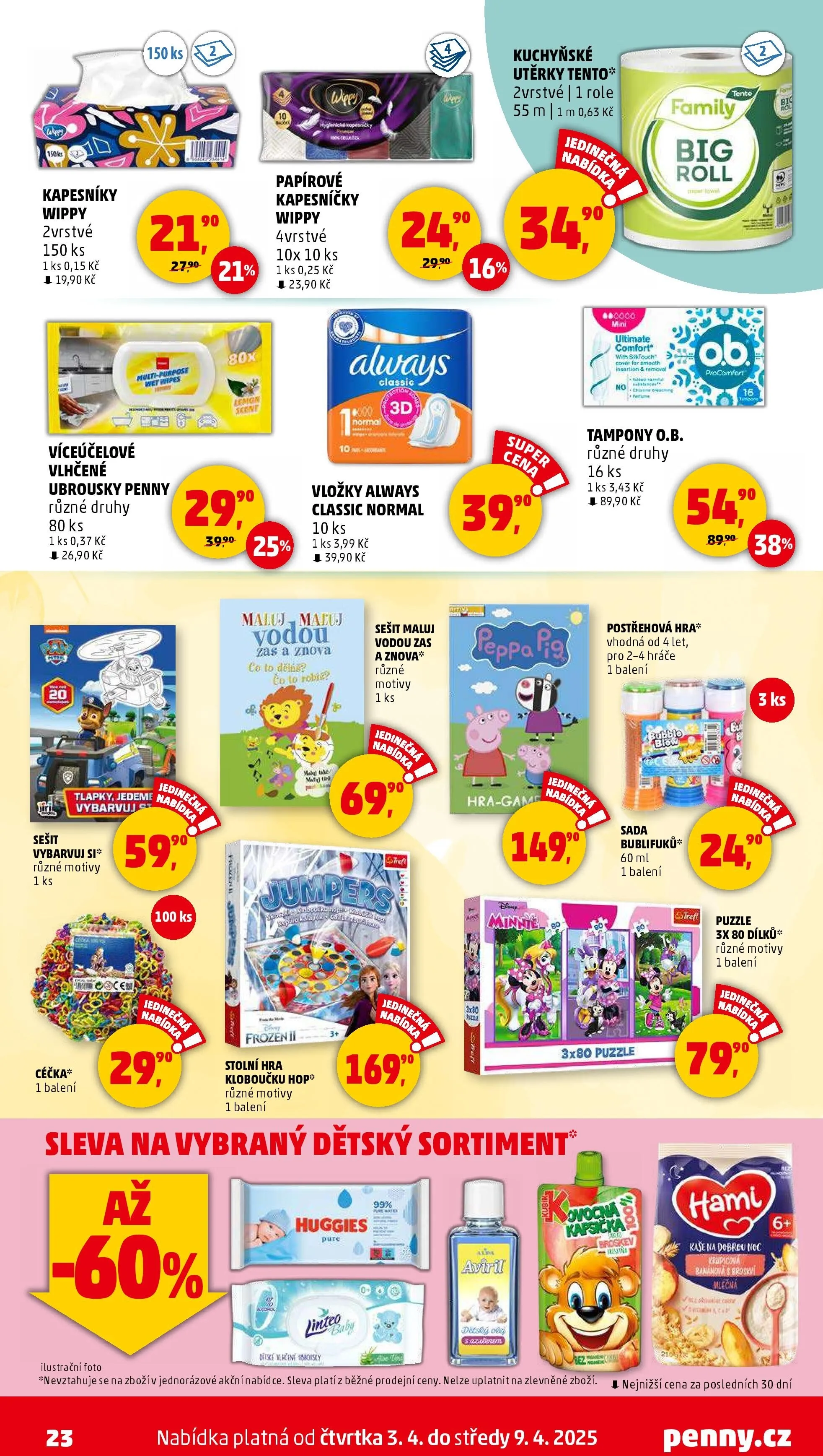 V letáku také najdete akční nabídky na vybraný dětský sortiment, včetně značky Huggies se slevou 60 %. Nabídka platí od čtvrtka 3.4. do středy 9.4.2025. Navštivte nás a využijte nejnižší ceny za posledních 30 dní!