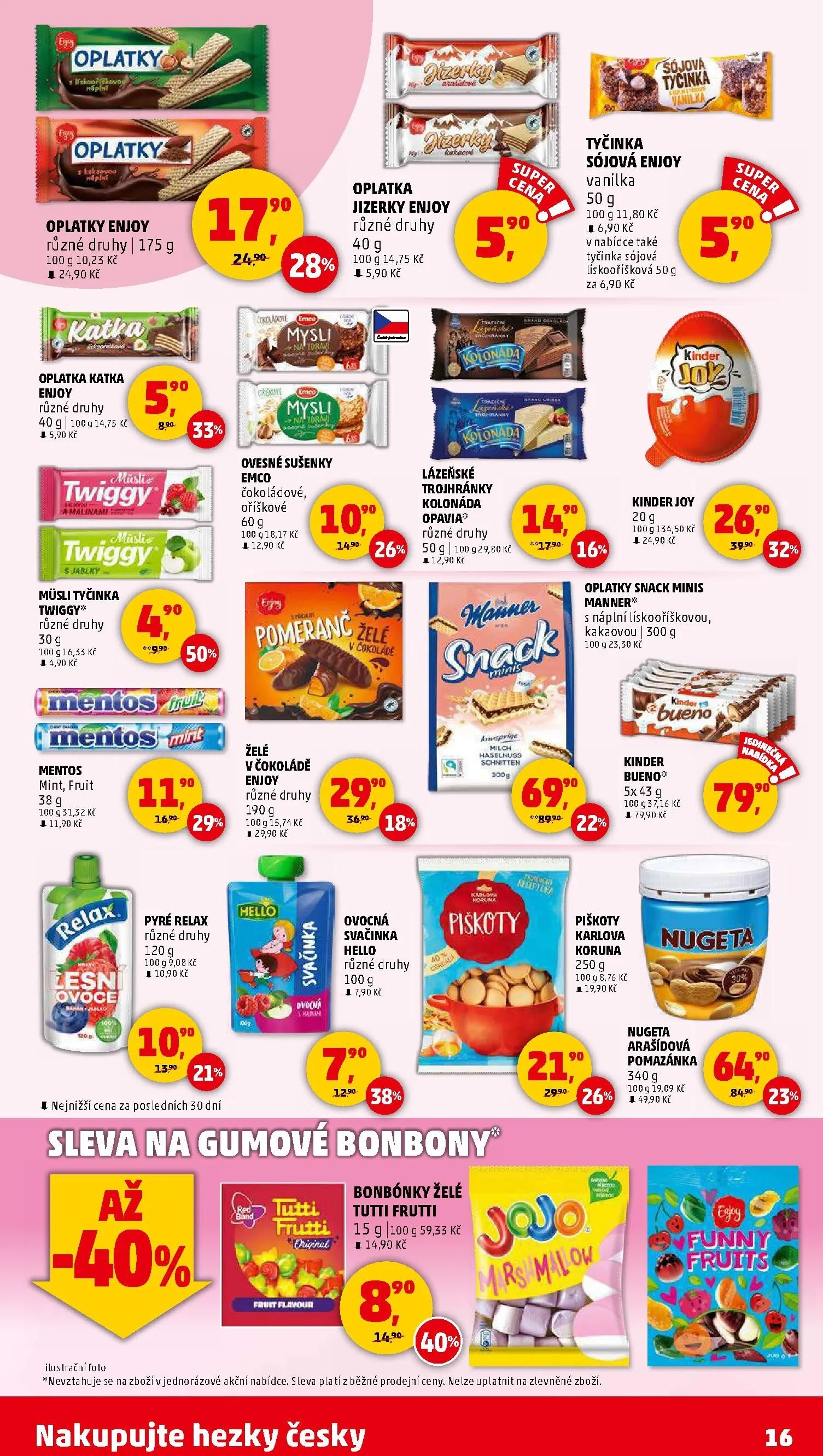 Nezapomeňte na Kinder produkty, jako jsou Kinder Bueno a trojhránky Kolonáda, které jsou také v akci. Pro sladké chvíle si můžete pořídit bonbony Tutti Frutti nebo piškoty Karlova Koruna.