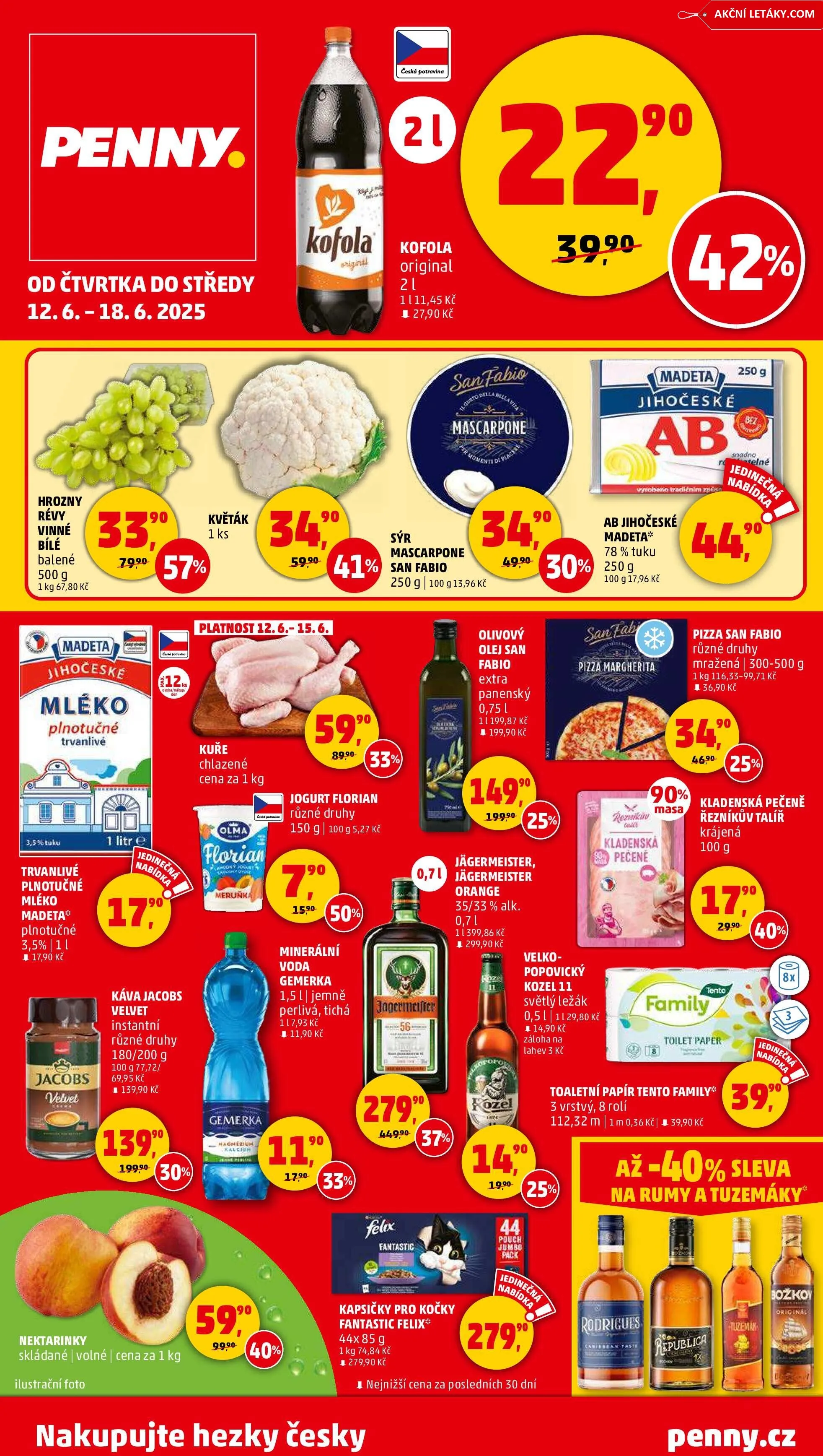 V letáku obchodu Penny Market od 12.6. do 18.6.2025 najdete širokou nabídku kvalitních produktů. Mezi nimi se objevuje oblíbená česká Kofola za 27,90 Kč a sýr mascarpone San Fabio za 199,90 Kč. Nechybí ani olivový olej San Fabio, který je k dostání za 111,99 Kč.