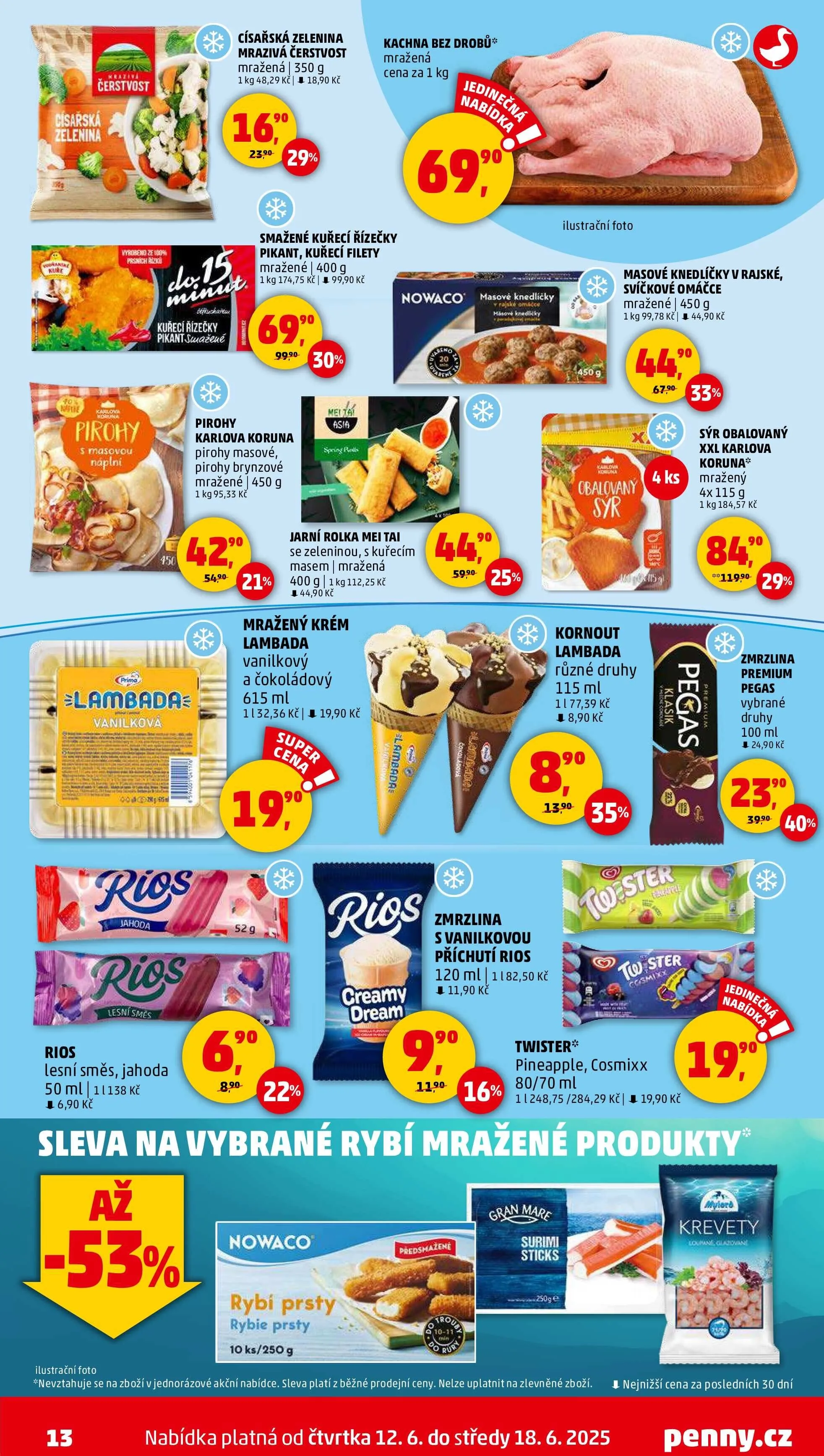 V letáku obchodu Penny Market najdete širokou nabídku mražených produktů. Mezi nimi se objevují kachny bez drobů, čerstvá císařská zelenina a pirohy s masovou náplní. Dále si můžete vybrat smažené kuřecí řízečky, masové knedlíčky v rajské a svíčkové omáčce, nebo obalovaný sýr.
