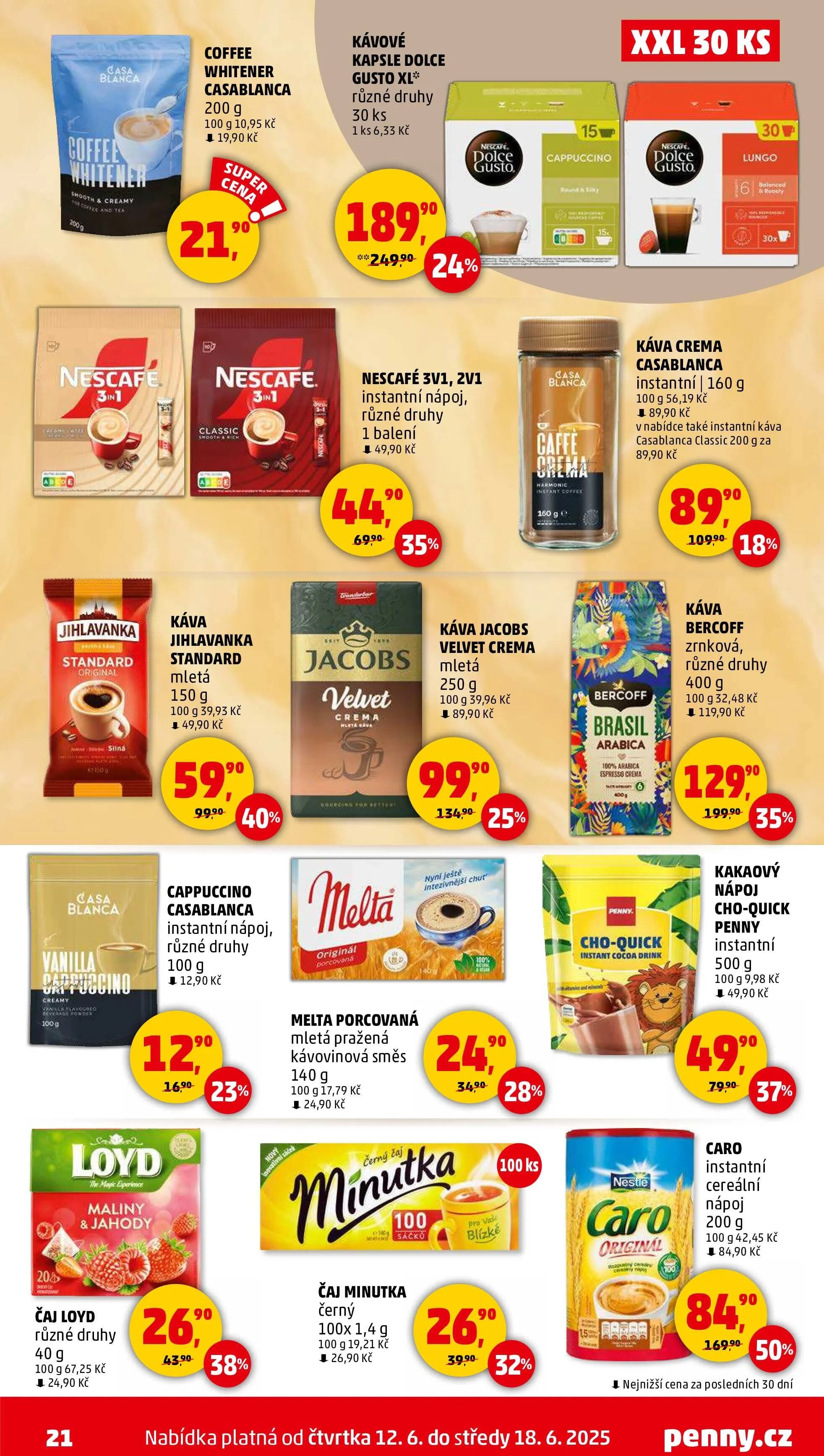 V letáku obchodu Penny Market najdete širokou nabídku káv a čajů za skvělé ceny. Mezi produkty se objevují instantní kávy jako Nescafé 3v1 a cappuccino od Casablanca, které jsou dostupné v různých variantách. Dále si můžete vybrat z mleté kávy Jihlavanka standard nebo Jacobs Velvet crema. Pro milovníky čaje jsou k dispozici různé druhy čaje Loyd a černý čaj Minutka. Nezapomeňte také na kakaový nápoj Cho-quick a cereální nápoj Caro. Akce platí od 12.6. do 18.6.2025. Navštivte penny.cz pro více informací.