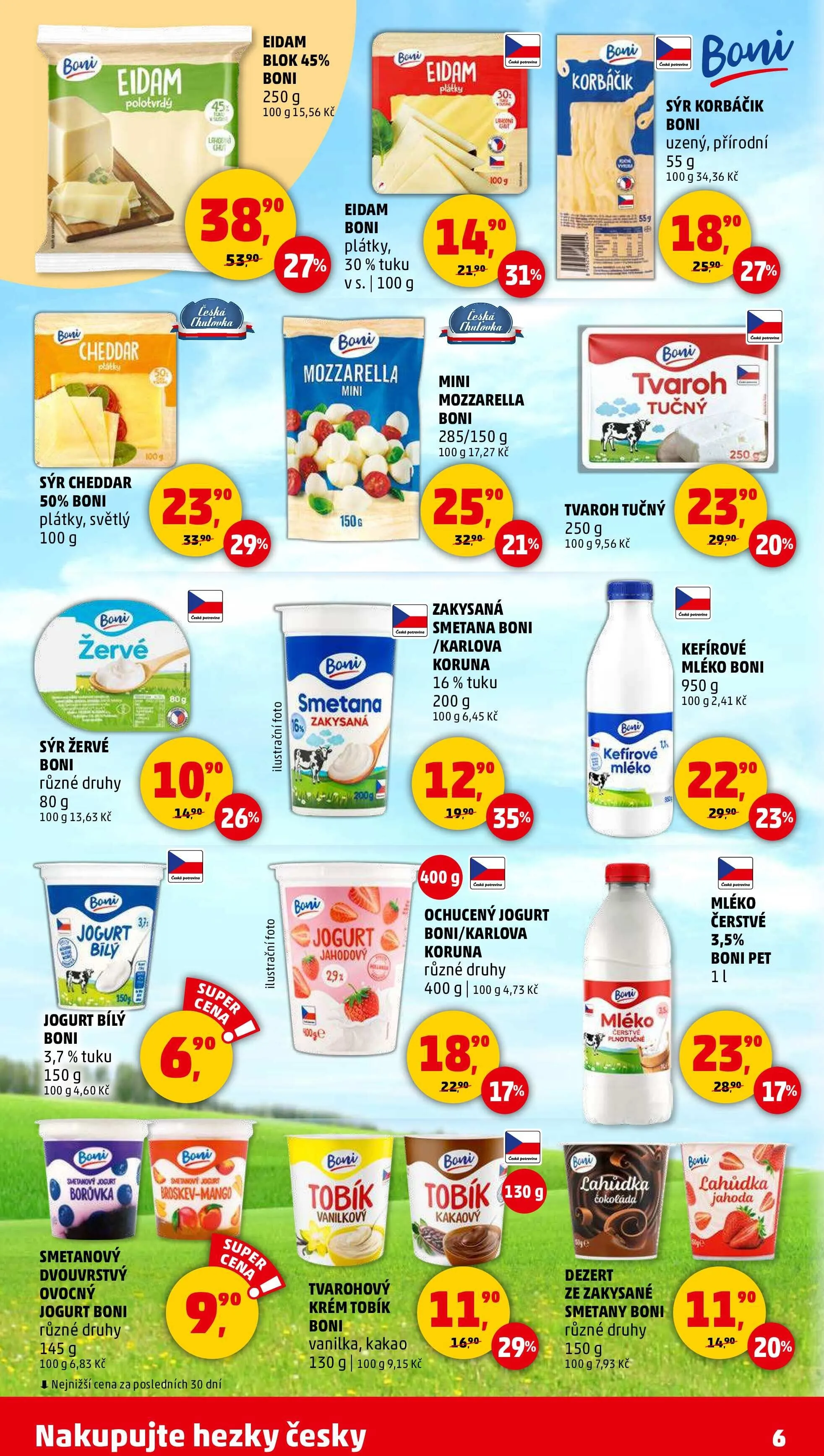 V letáku obchodu Penny Market najdete širokou nabídku mléčných výrobků značky Boni. Mezi nimi se nachází eidam v různých formách, jako jsou plátky s 30 % tuku a bloky. Dále nabízíme mini mozzarellu a zakysanou smetanu s 16 % tuku. Pro milovníky tvarohu máme tučný tvaroh a žervé v různých variantách. Nezapomněli jsme ani na jogurty, včetně bílého jogurtu a ovocných variant, jako je jahodový a vanilkový jogurt Tobík. Naše kefírové mléko a čerstvé mléko jsou také skvělou volbou pro každodenní použití. Všechny produkty jsou k dispozici za výhodné ceny, které potěší každého zákazníka. Nakupujte hezky česky!