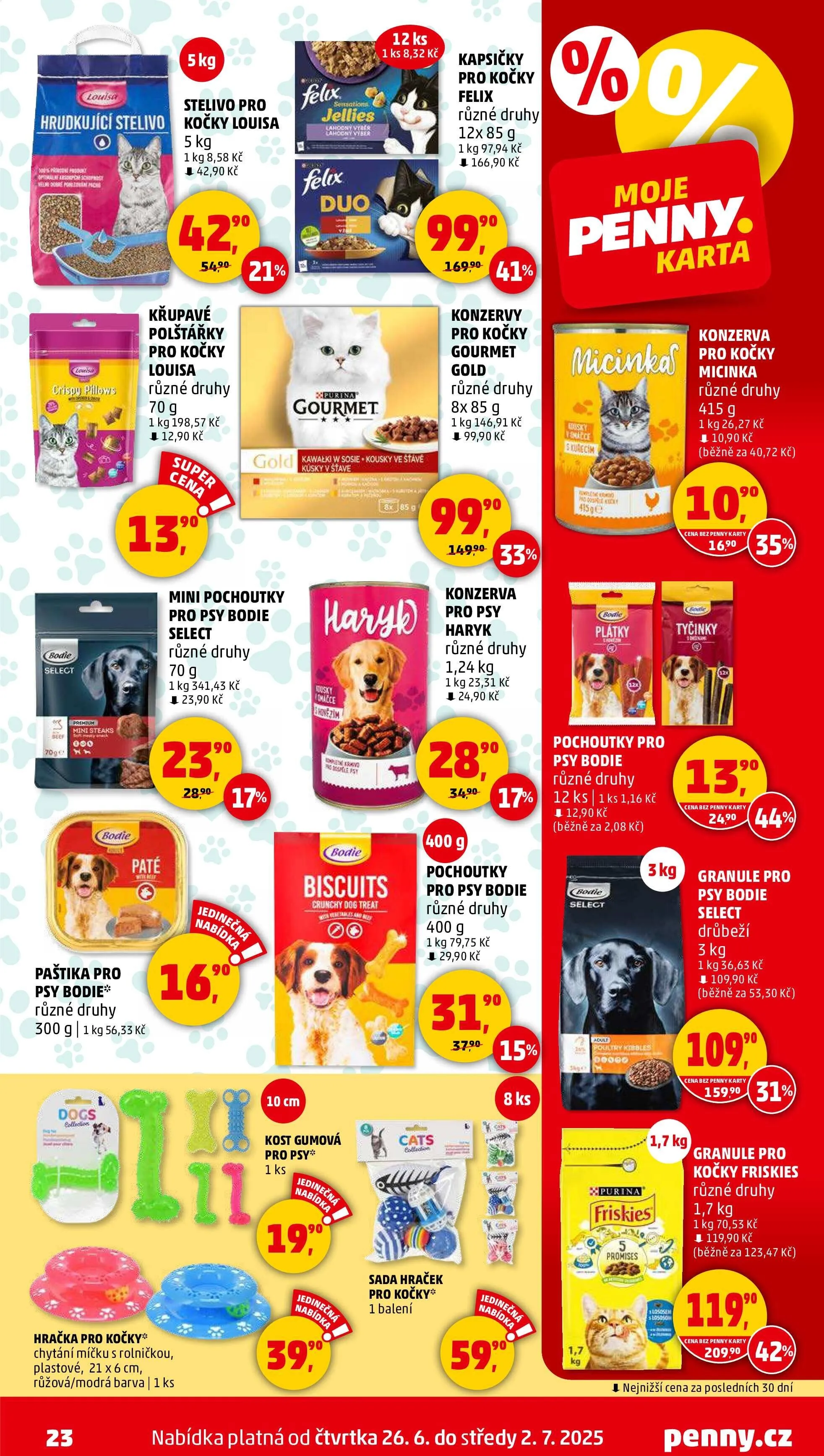 V letáku obchodu Penny Market najdete širokou nabídku produktů pro vaše domácí mazlíčky. Nabízíme kapsičky pro kočky Louisa, hrudkující stelivo a křupavé polštářky v různých druzích. Pro psy máme mini pochoutky Bodie a konzervy Haryk. Nezapomněli jsme ani na hračky pro kočky a gumové kostky pro psy. Všechny produkty jsou za výhodné ceny, například granule pro psy Bodie za 109,90 Kč nebo konzerva pro kočky Micinka za 10,90 Kč. Akce platí od čtvrtka 26.6. do středy 2.7. 2025. Navštivte penny.cz pro více informací!
