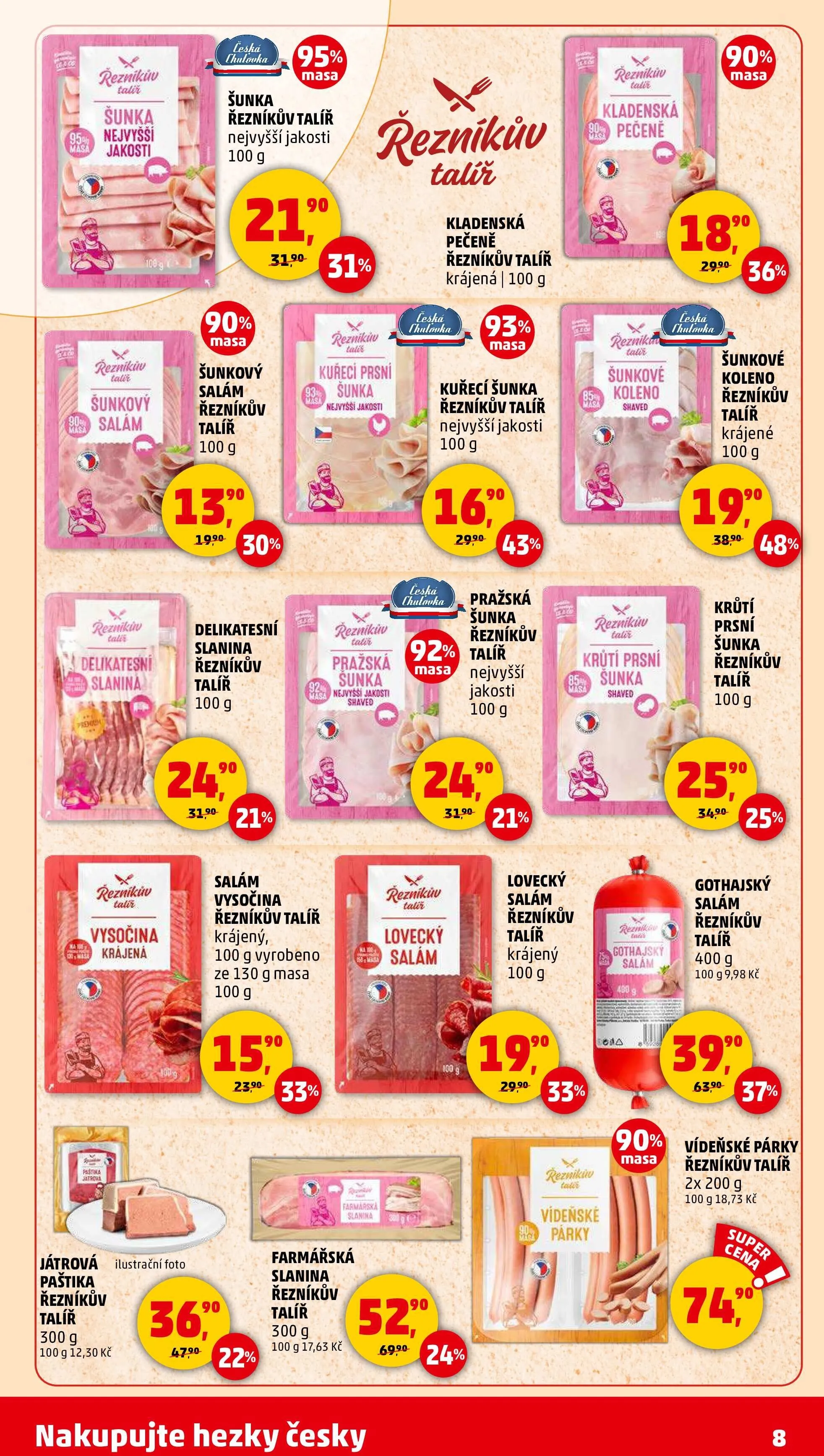 V letáku obchodu Penny Market najdete širokou nabídku kvalitních masných výrobků. Mezi nimi se objevují produkty jako řezníkův talíř, který zahrnuje šunku nejvyšší jakosti, šunkový salám a delikatesní slaninu, všechny v praktickém krájeném balení po 100 g. Dále si můžete vybrat z vysočinského salámu, kuřecí šunky a loveckého salámu, které jsou také dostupné v krájené formě.