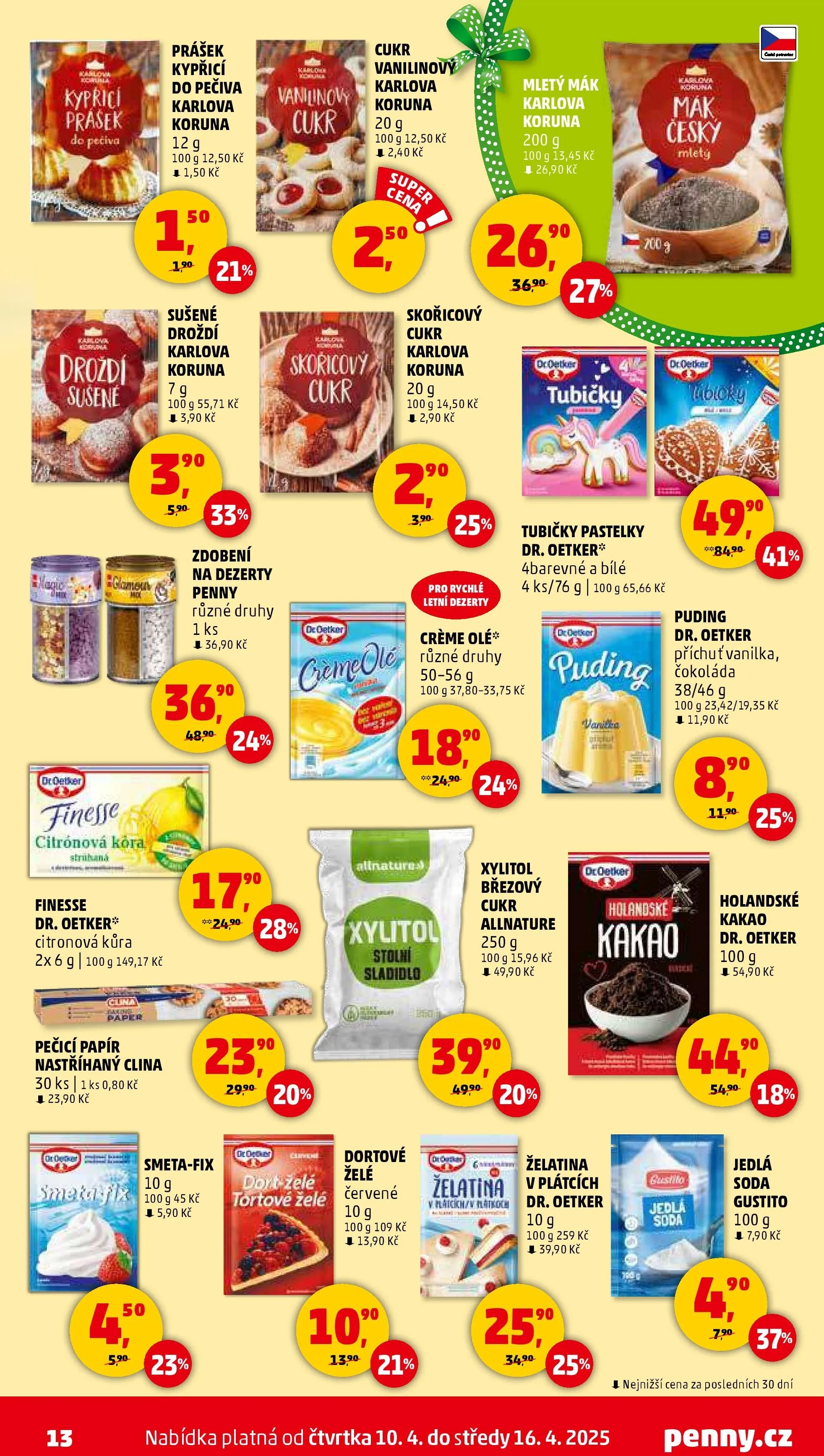 V letáku obchodu Penny Market najdete širokou nabídku produktů pro pečení a zdobení dezertů. Mezi nimi je kypřicí prášek Karlova, sušené droždí a vanilínový cukr, které jsou ideální pro přípravu různých sladkých pokrmů. Nezapomeňte také na pečicí papír, který usnadní pečení, a tubičky s barevnými pastelkami od Dr. Oetkera pro kreativní zdobení.