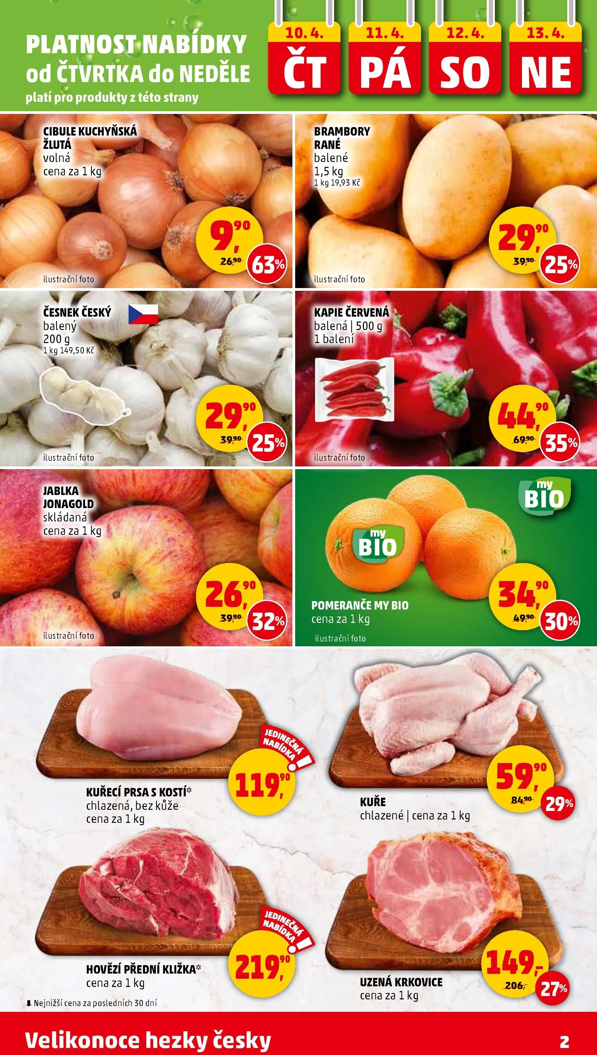 Na své si přijdou i milovníci jablek, konkrétně odrůdy Jonagold, a to za cenu 90 Kč za 1 kg. Pro přípravu chutných pokrmů doporučujeme chlazená kuřecí prsa s kostí a hovězí přední kližku, obě za 90 Kč za 1 kg.