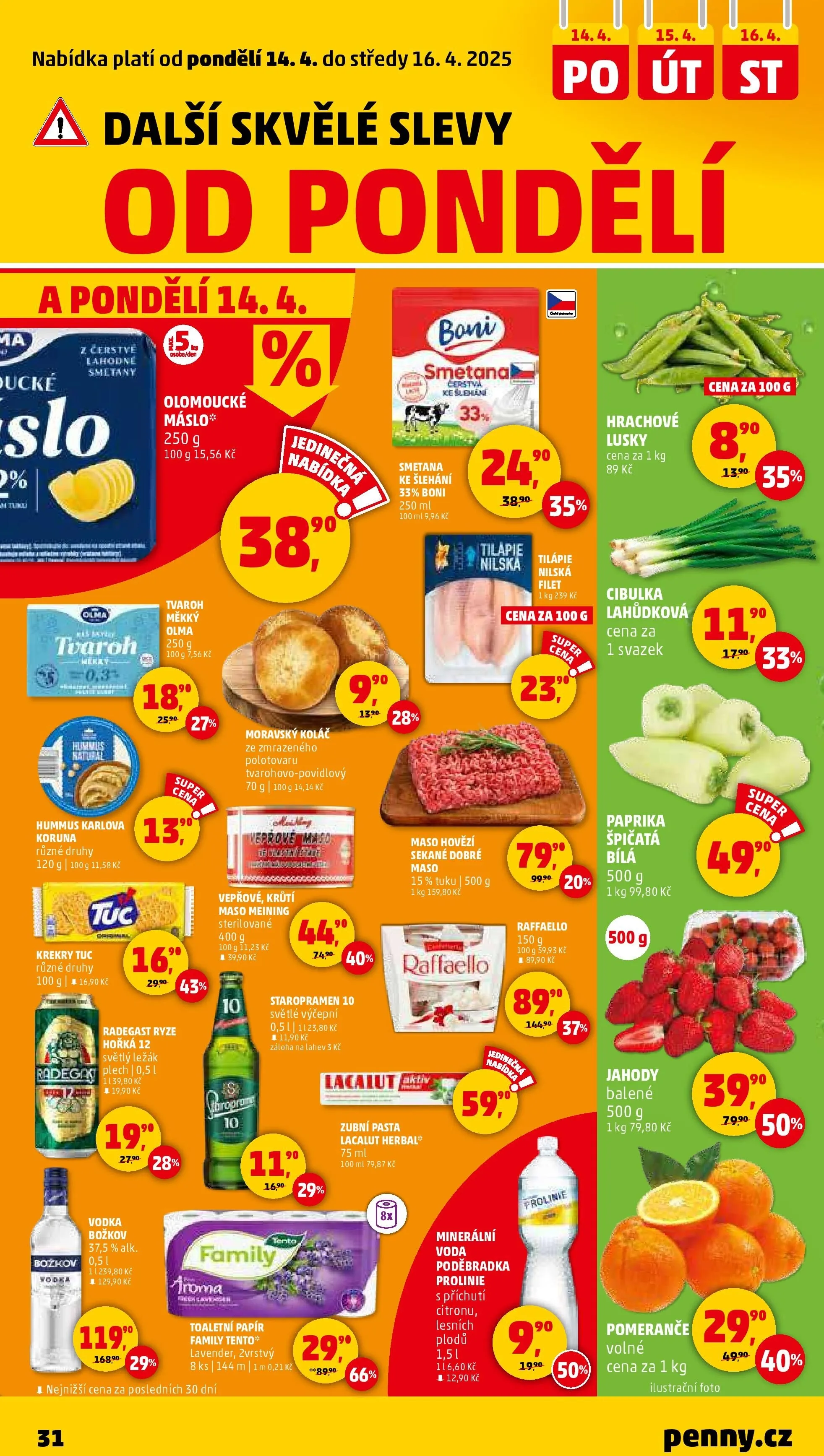 Pro milovníky sladkostí jsou v akci Raffaello a hrachové lusky. Z čerstvé zeleniny si můžete vybrat cibulku lahůdkovou a špičatou bílou papriku. A nezapomeňte na jahody a pomeranče za výhodné ceny. Navštivte Penny Market a využijte těchto skvělých nabídek!