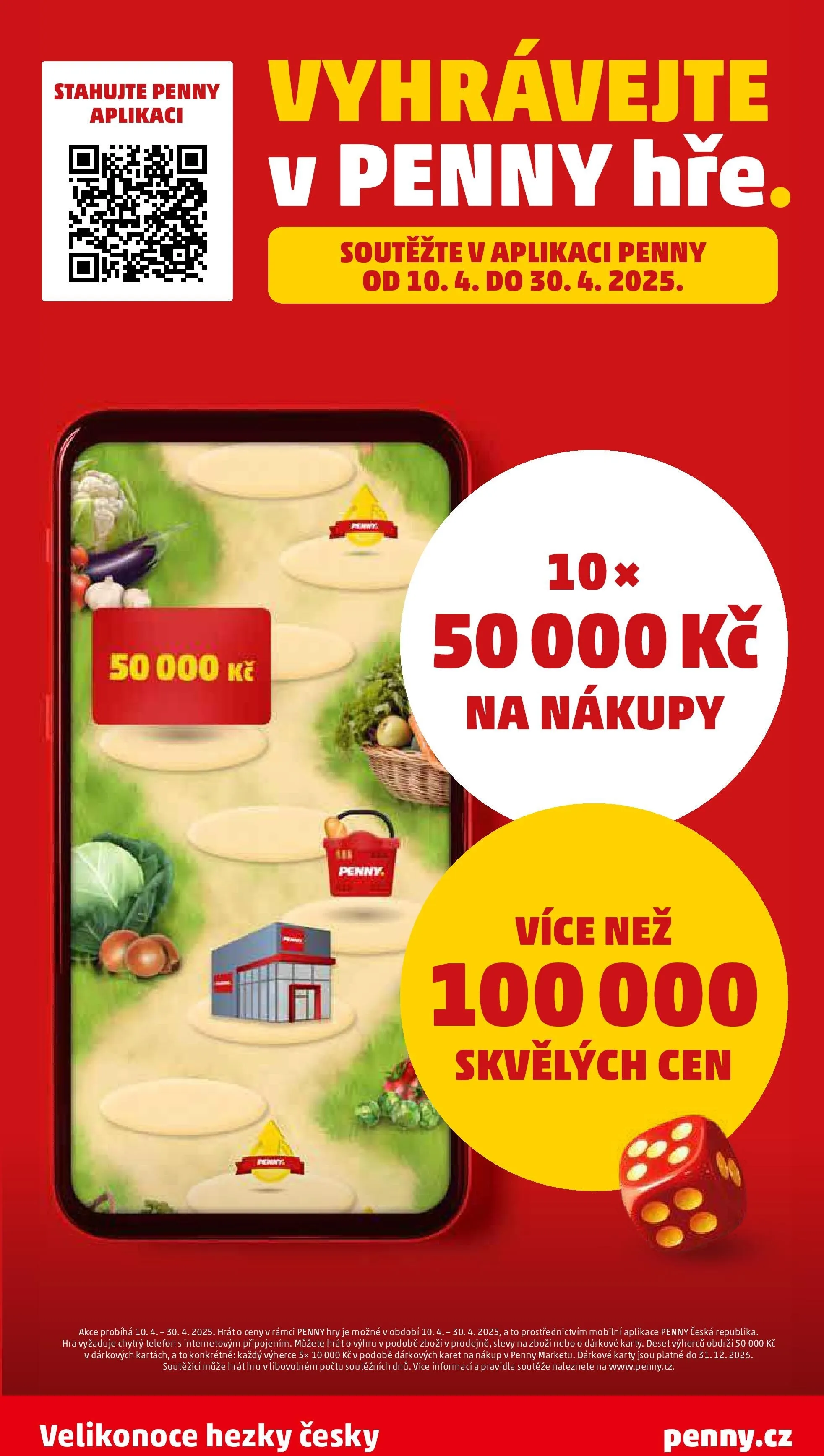 Stahujte Penny aplikaci a vyhrávejte v Penny hře! Soutěžte od 10. do 30. dubna 2025 a hrajte o více než 100 000 skvělých cen. Hra probíhá prostřednictvím mobilní aplikace Penny Česká republika. Můžete vyhrát zboží v prodejně, slevy nebo dárkové karty. Deset výherců obdrží 50 000 Kč v dárkových kartách, každý výherce 5x 10 000 Kč na nákup v Penny Marketu. Dárkové karty jsou platné do 31. 12. 2026. Hrajte v libovolném počtu soutěžních dnů a zjistěte více na penny.cz. Velikonoce hezky česky!
