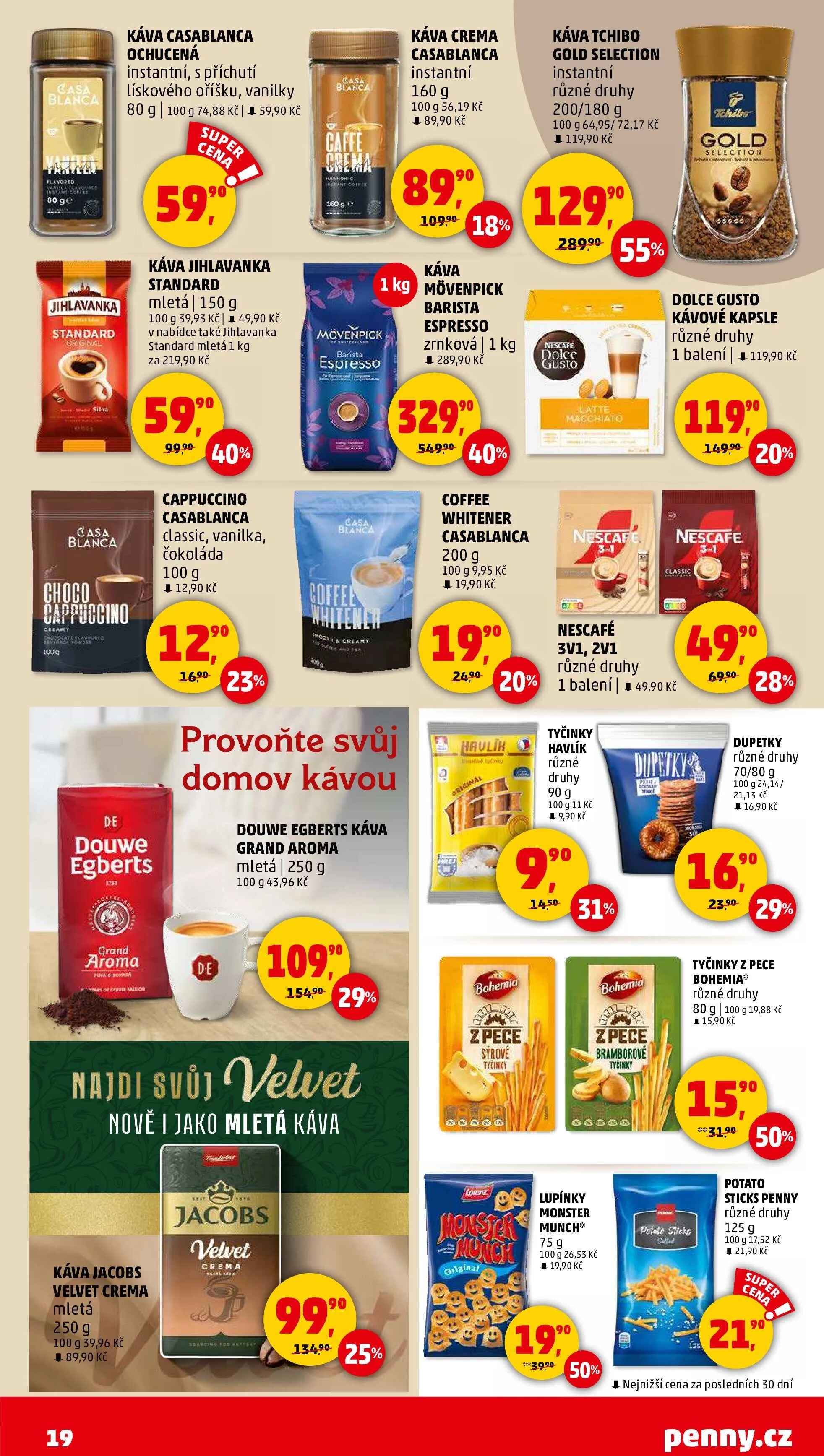 V letáku obchodu Penny Market najdete širokou nabídku káv a snacků. Mezi kávami se objevují značky jako Jihlavanka, Casablanca a Mövenpick. Například mletá káva Jihlavanka (150 g) je k dostání za 49,90 Kč, zatímco instantní káva Casablanca s příchutí lískového oříšku a vanilky (80 g) stojí 59,90 Kč.