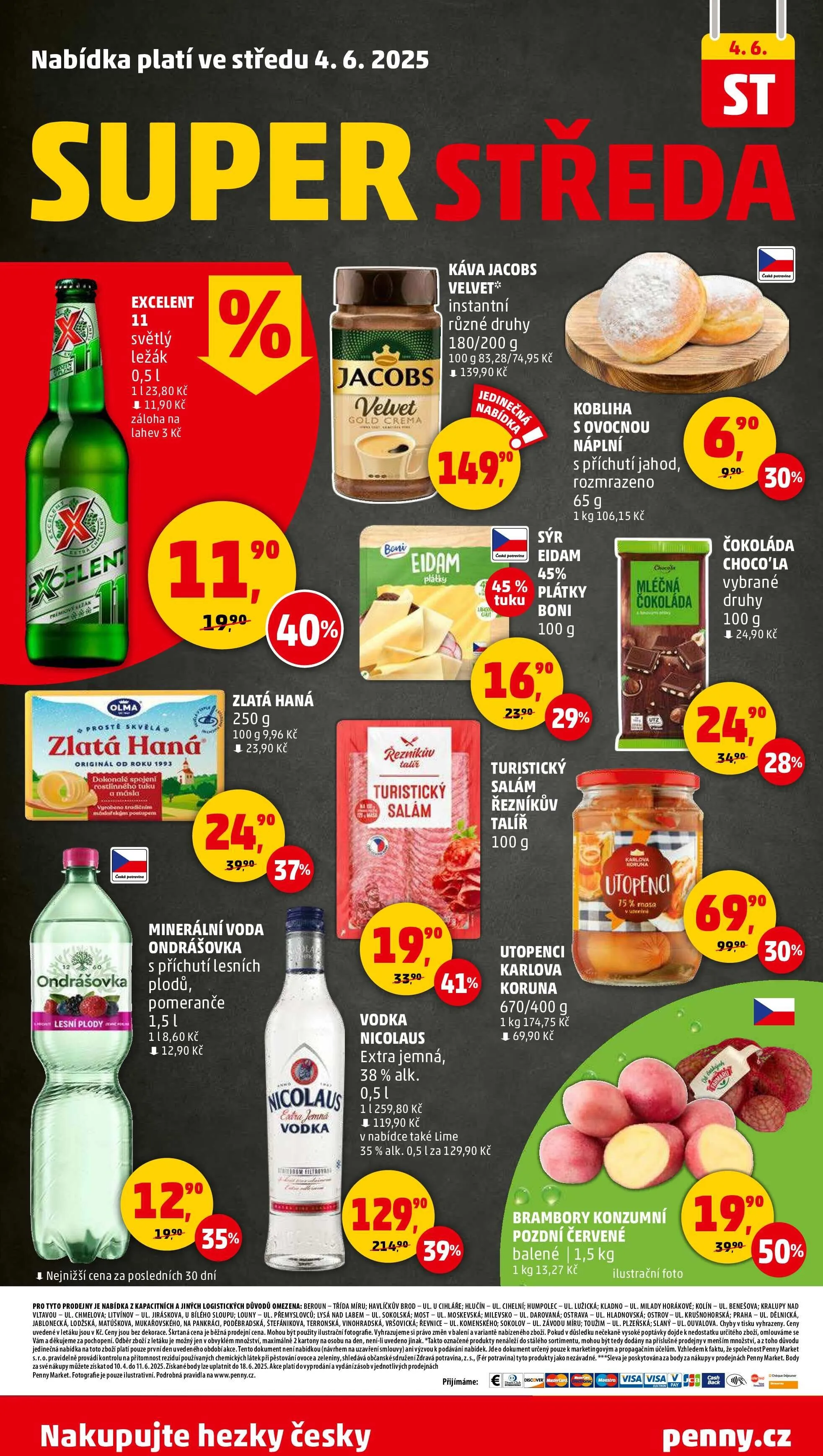 V letáku obchodu Penny Market na středu 4.6.2025 najdete širokou nabídku produktů za skvělé ceny. Mezi nimi se objevuje světlý ležák za 11,90 Kč, instantní káva Jacobs Velvet různých druhů za 139,90 Kč, a lahodné koblihy s ovocnou náplní za 19,90 Kč.