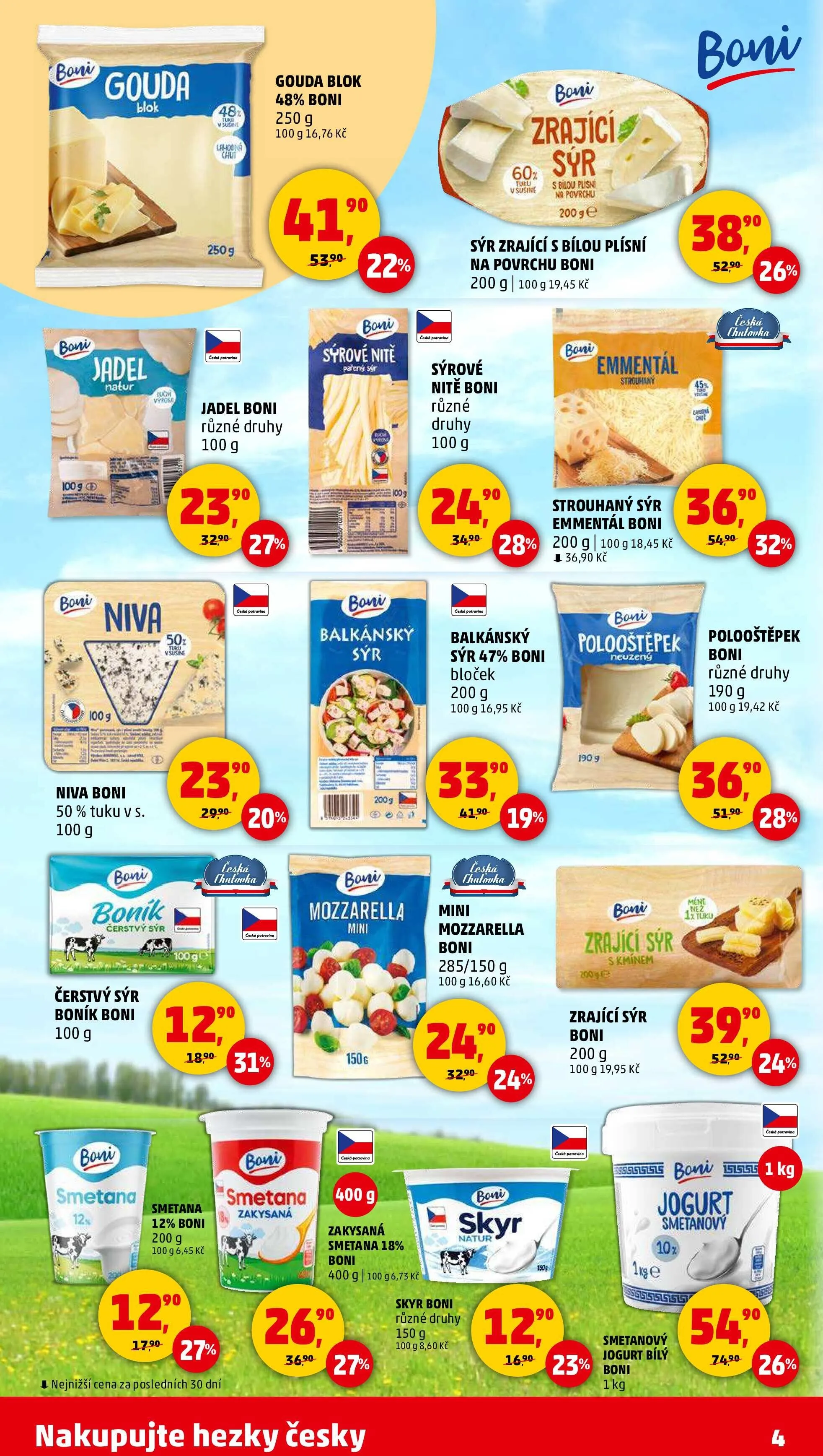 V letáku obchodu Penny Market najdete širokou nabídku kvalitních mléčných výrobků značky Boni. Mezi nimi se nachází Gouda blok (250 g) za 16,76 Kč/100 g, zrající sýr s bílou plísní (200 g) za 19,45 Kč/100 g a čerstvý sýr (různé druhy) za 90 Kč/100 g.