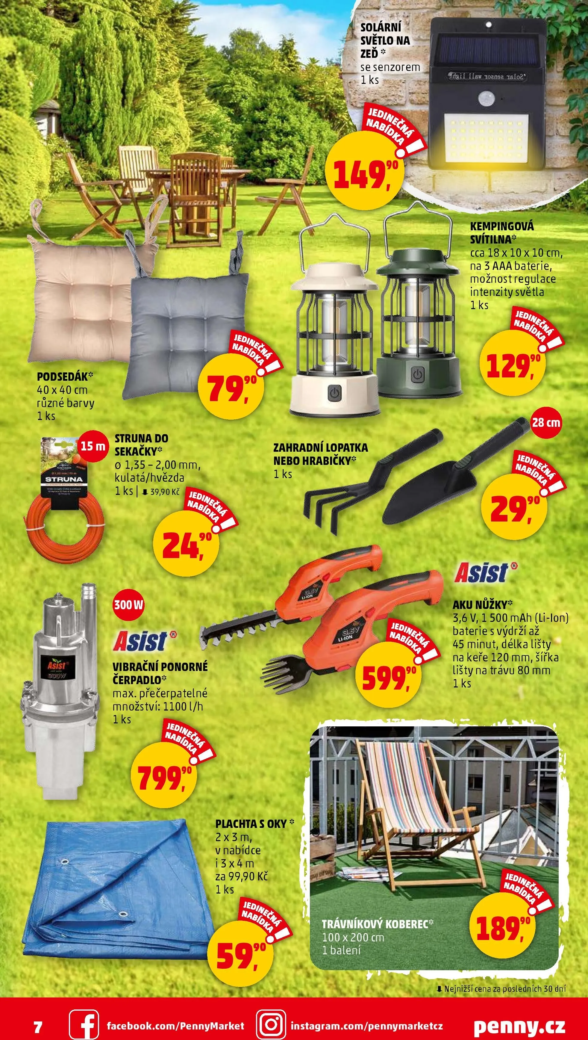 V letáku obchodu Penny Market najdete širokou nabídku produktů pro vaši zahradu a domácnost. Mezi novinkami je solární světlo na zeď se senzorem, které přináší úsporu energie a bezpečnost. Dále nabízíme podsedáky o rozměrech 40x40 cm v různých barvách, ideální pro pohodlné posezení.
