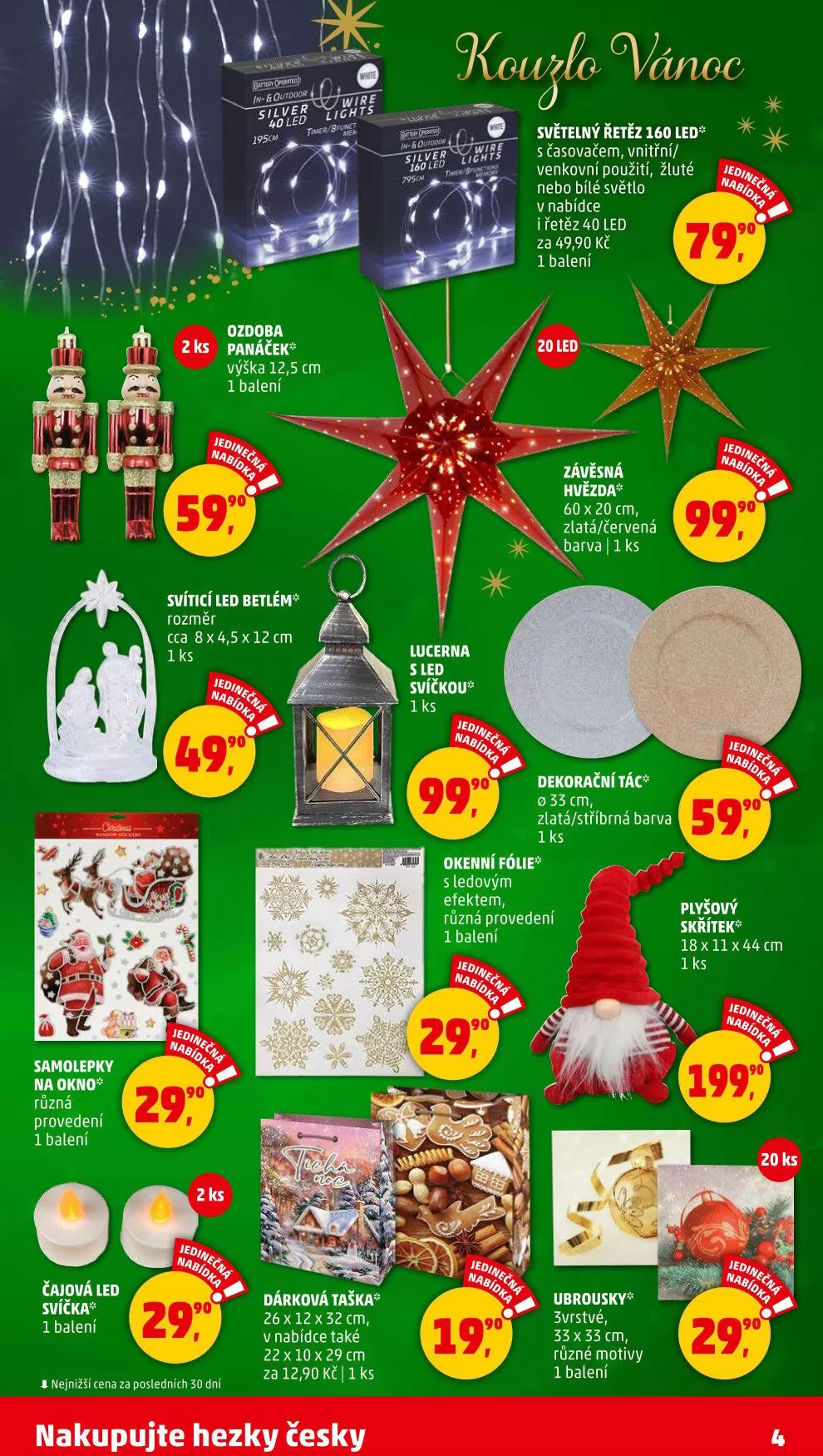 V letáku obchodu Penny Market najdete širokou nabídku vánočních dekorací a dárkových předmětů. Mezi produkty se objevují svítící LED betlémy, které mají rozměr cca 8x4,5x12 cm, a dekorativní lucerny s LED svíčkou. Pro milovníky světelných efektů je k dispozici světelný řetěz s 160 LED diodami, který je vhodný jak do interiéru, tak exteriéru.