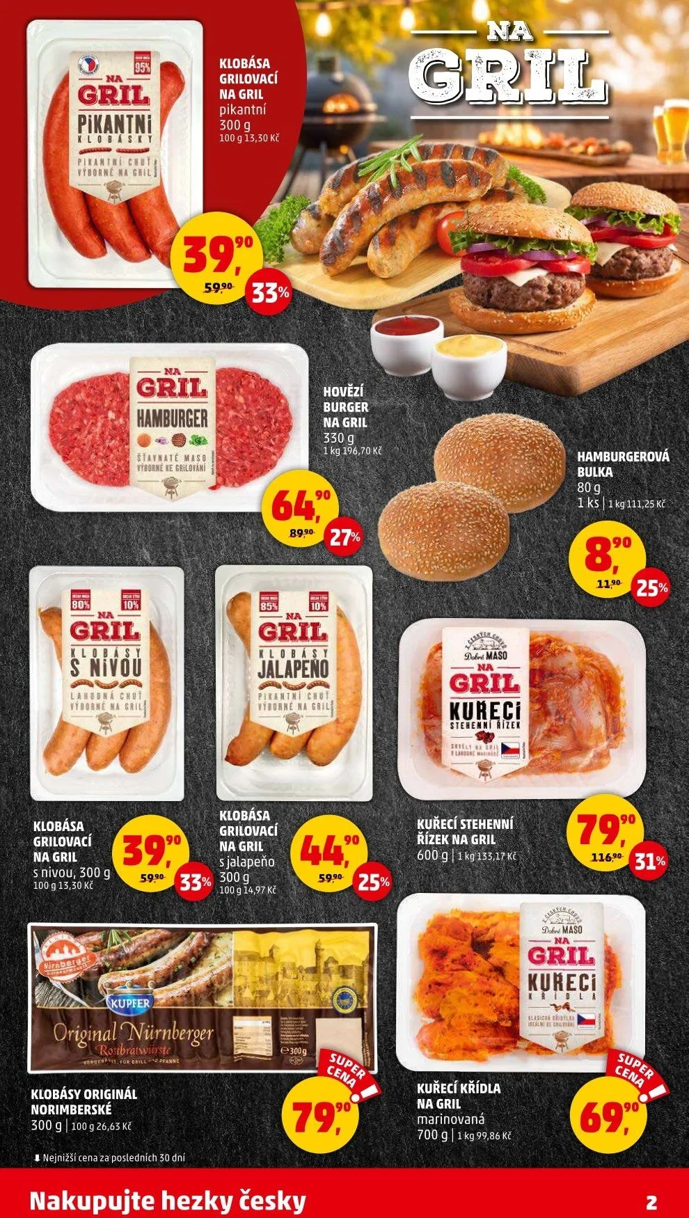 Dále si můžete vybrat hovězí burger na gril (330 g) za 196,70 Kč/kg nebo kuřecí stehenní řízek na gril (600 g) a marinovaná kuřecí křídla (700 g) za 99,86 Kč/kg. Nezapomeňte také na hamburgerové bulky (80 g) pro dokonalé servírování. Nakupujte hezky česky a užijte si grilovací sezónu!