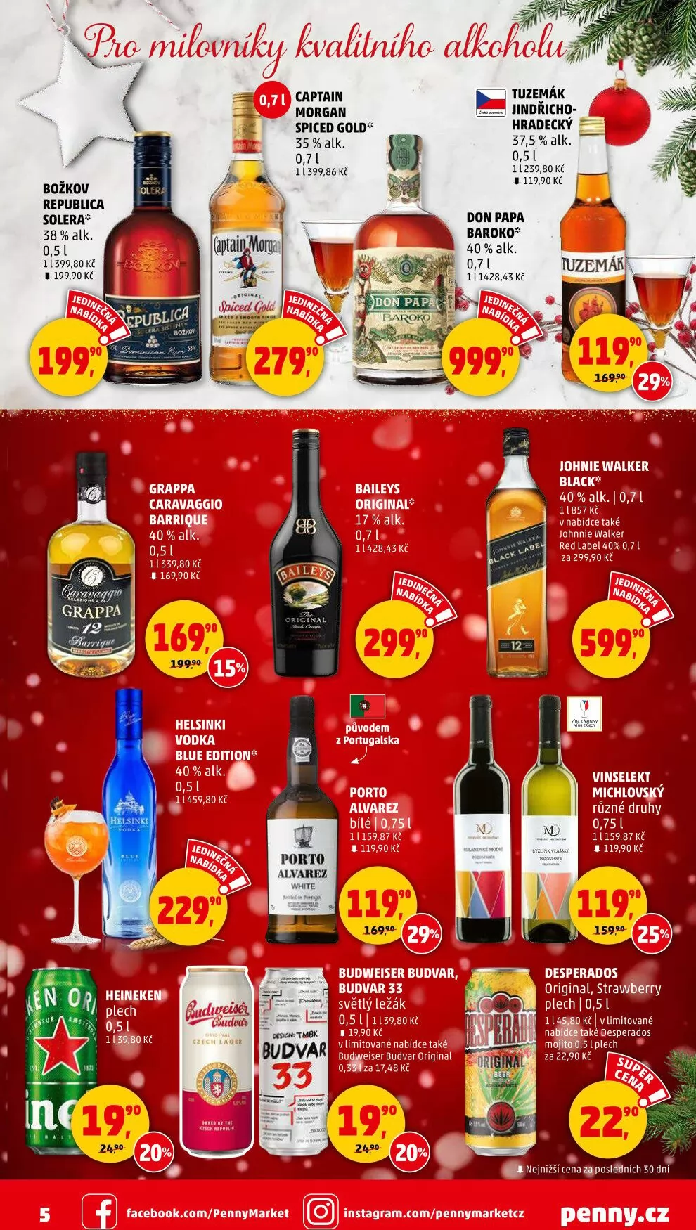 V letáku obchodu Penny Market najdete širokou nabídku alkoholických nápojů za skvělé ceny. Mezi nimi se objevují populární značky jako Captain Morgan Spiced Gold za 599,86 Kč, tuzemák Jindřichohradecký za 119,90 Kč a Božkov Republica Solera za 199,90 Kč.