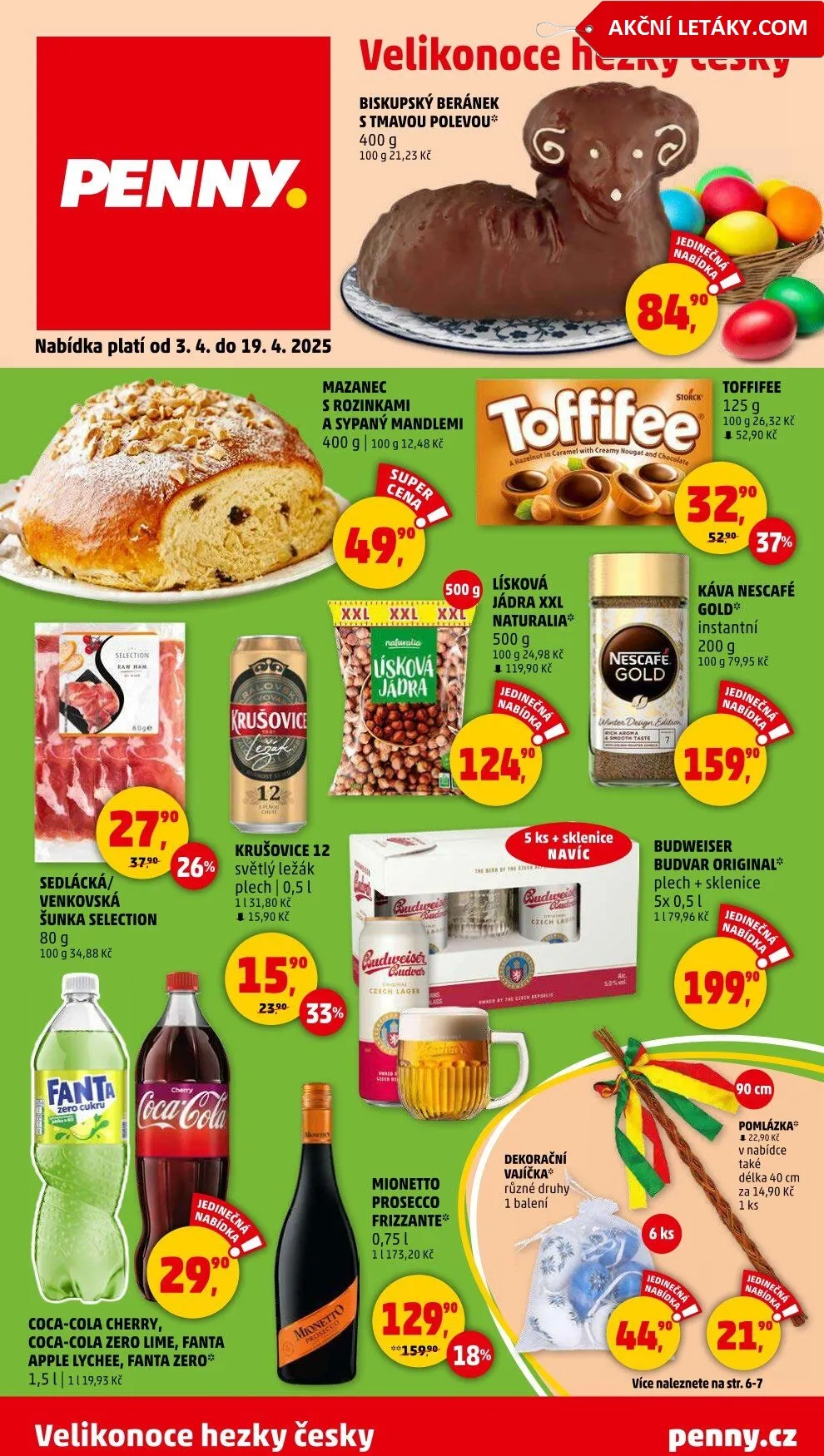 V letáku obchodu Penny Market najdete skvělou nabídku produktů, která platí od 3.4. do 19.4. 2025. Mezi lákavé položky patří mazanec s rozinkami a sypaný mandlemi za 12,48 Kč/100 g, biskupský beránek s tmavou polevou za 21,23 Kč/100 g a oblíbené toffifee za 26,32 Kč/100 g.