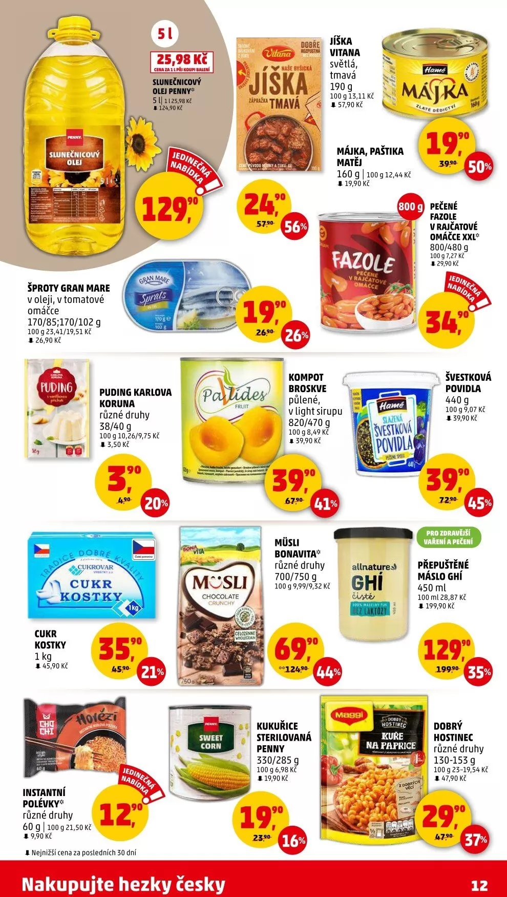 V letáku obchodu Penny Market najdete širokou nabídku produktů za výhodné ceny. Mezi nimi je jíška Vitana, světlá i tmavá, za 57,90 Kč za 190 g. Dále slunečnicový olej Penny za 124,90 Kč a šproty Gran Mare v oleji nebo tomatové omáčce za 51 Kč.