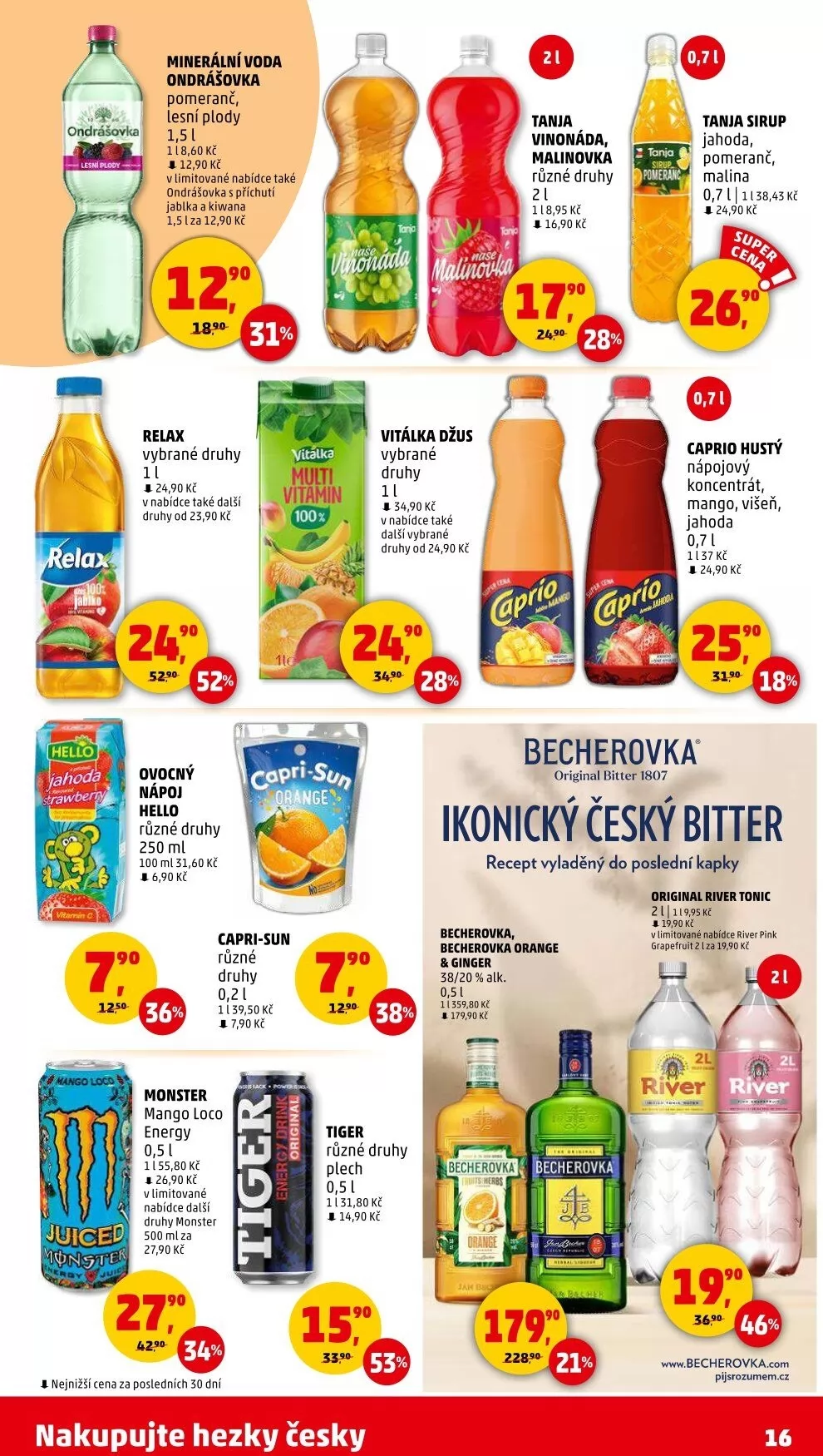 Pokud hledáte něco silnějšího, Becherovka v různých variantách, včetně ikonického bitteru, je k dispozici od 36 %. A pro fanoušky energetických nápojů je tu Monster Mango Loco za 26,90 Kč.