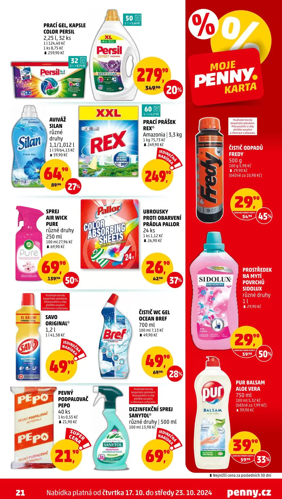 V letáku obchodu Penny Market najdete širokou nabídku produktů pro domácnost. Mezi nimi se nachází prací gel a kapsle značky Color Persii, které jsou k dispozici za 259,90 Kč. Aviváže Silan v různých druzích jsou také v akci, přičemž cena začíná na 64,90 Kč.