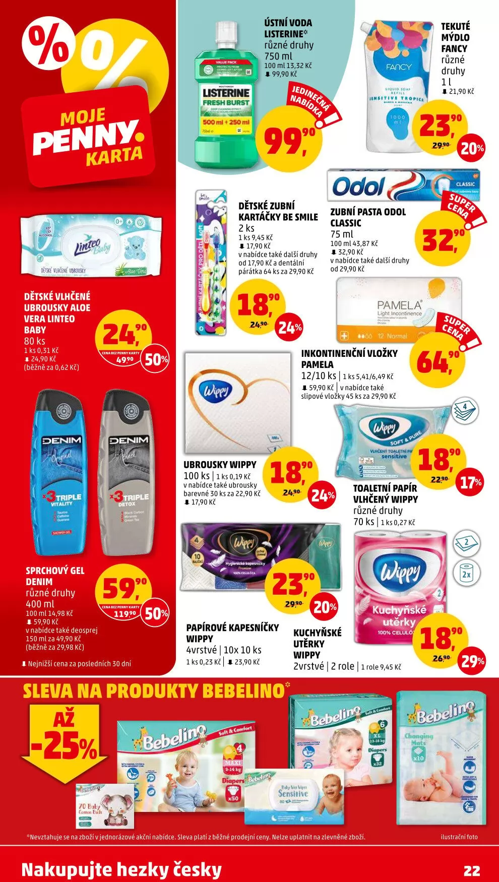 V letáku obchodu Penny Market najdete širokou nabídku produktů pro každodenní potřebu. Mezi nimi je ústní voda Listerine Fresh Burst v různých velikostech, 750 ml za 99,90 Kč a 100 ml za 90 Kč. Dále nabízíme dětské vlhčené ubrousky s aloe a zubní kartáčky Be Smile za 9,45 Kč.