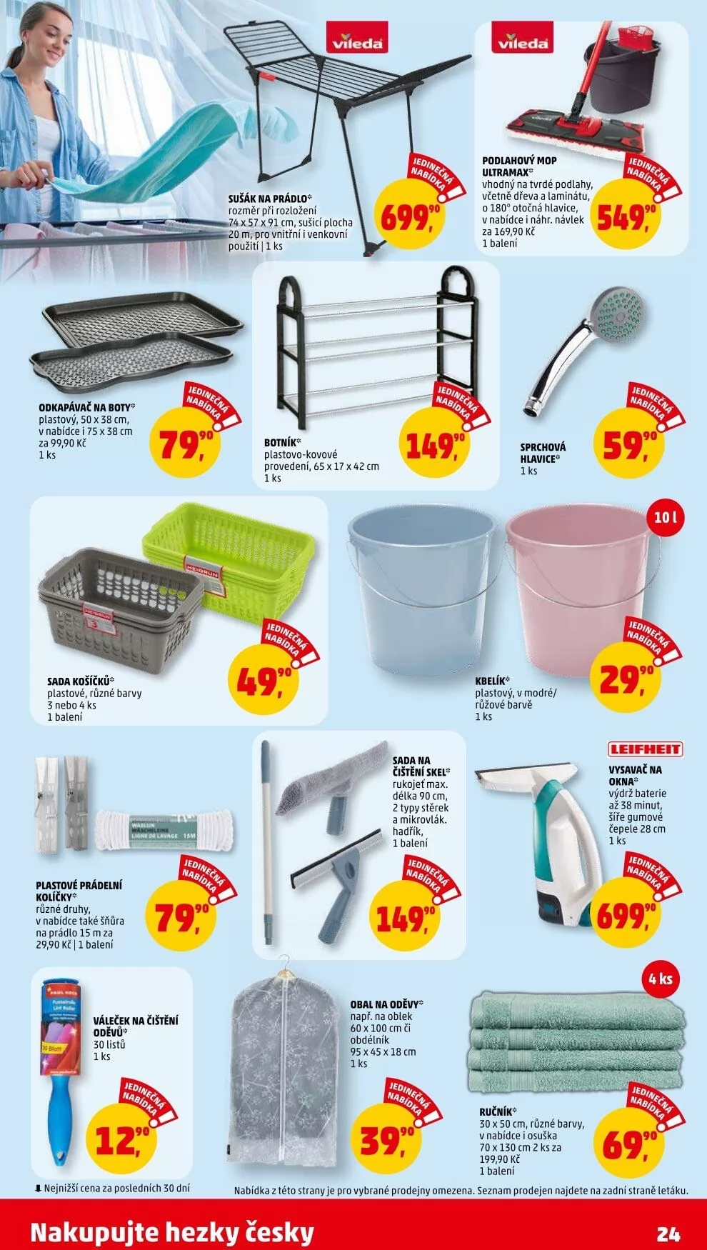 V letáku obchodu Penny Market najdete širokou nabídku praktických produktů pro domácnost. Mezi nimi je podlahový mop Ultramax, který je vhodný na tvrdé podlahy, včetně dřeva a laminátu, s otočnou hlavicí. Dále nabízíme plastovo-kovový botník o rozměrech 65 x 17 x 42 cm a plastový odkapávač na boty.